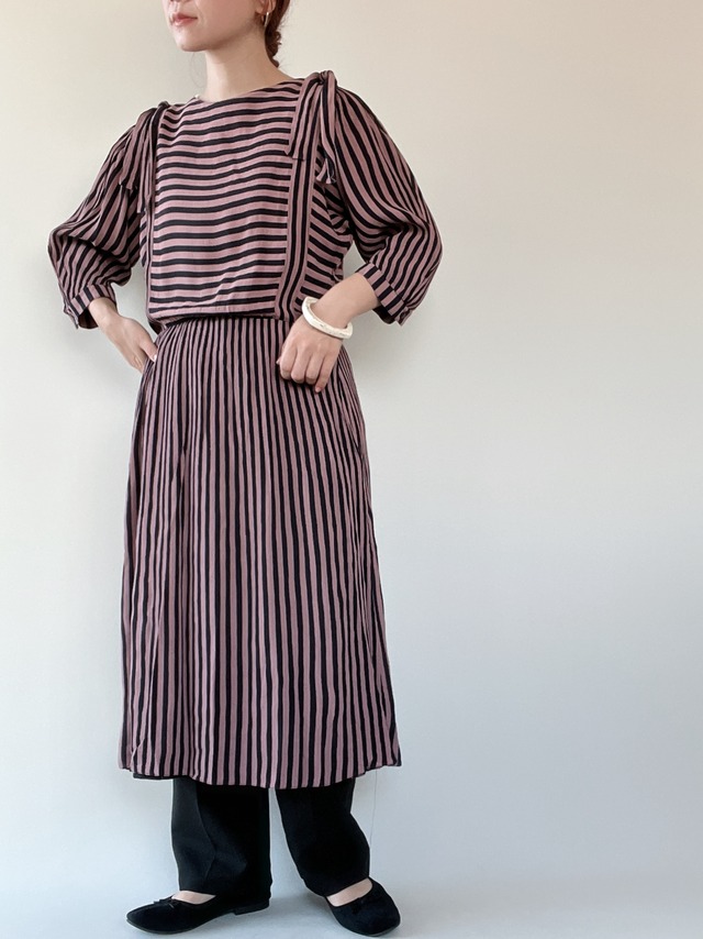 落ち感のある柔らかなビスコース素材の ジャーマニー製ワンピースです。 ココアブラウンとブラックカラーが ストライプとボーダーにデザインされ、 肩に飾り紐がついています。 ウエストの切り替えから裾に向かって 広がりのあるスカートですが 落ちる生地感なので広がりすぎず、 ドルマンスリーブのような広めのアームで リラックス感と落ち着いた印象もあり 古着ならではな一点物感が楽しめるかと思います。 背中スナップボタン開閉となっており スカートのみ裏地がついています。 ◯サイズ(スタッフ身長152cm) 着丈 約112cm 肩幅 約37cm 身幅 測定不可 切り替え箇所 平置 約35cm(ゴムのためさらに伸びます) 袖丈 約41cm (平置き計測の為、多少の誤差が出る場合がございます。ご了承お願い致します。) ◯素材 ビスコース 裏地 ポリエステル ◯状態 ※目立つ傷やダメージはございません ◯配送方法 こちらの商品はレターパックにて発送させて頂きます。 ・日時指定なし ・対面受け取り 又、複数点ご購入ご希望の場合、 クロネコヤマトもしくはゆうパックとなる場合がございます。 (商品ご購入について) *当店は、すべてのアイテムが 古着.ビンテージの商品の取り扱いの為、 そのためそれらの特性上、ほつれ・シミ・汚れ・におい等がある場合がございます。 できる限りそれらの詳細をお伝えするよう努めますが、お伝えしきれない場合もございます。 USED,VINTAGEの特性をご理解ご了承の上、ご購入いただきますようお願い致します。 またカメラやパソコン環境の違いにより実際の色合いが異なって見える場合がございます。あらかじめご了承くだいさいませ。 基本的に返品、交換は行っておりませんので、ご購入前に気になる点がございましたらお気軽にお問い合わせください。 お手数ですが、 ご購入の際に必ずホーム画面左上メニュー下の「特定商取引法に基づく表記」を ご確認頂きます様、宜しくお願いいたします。