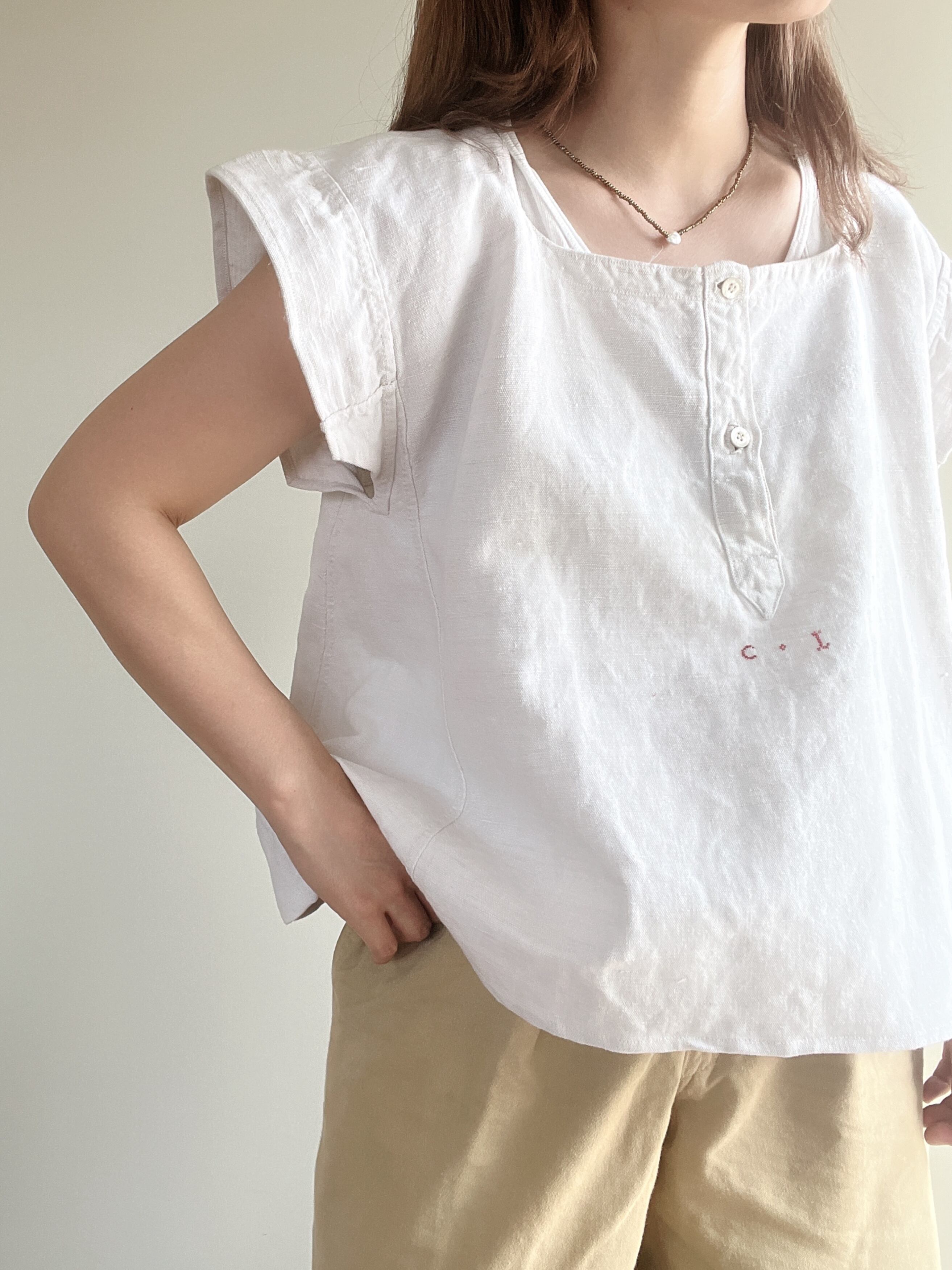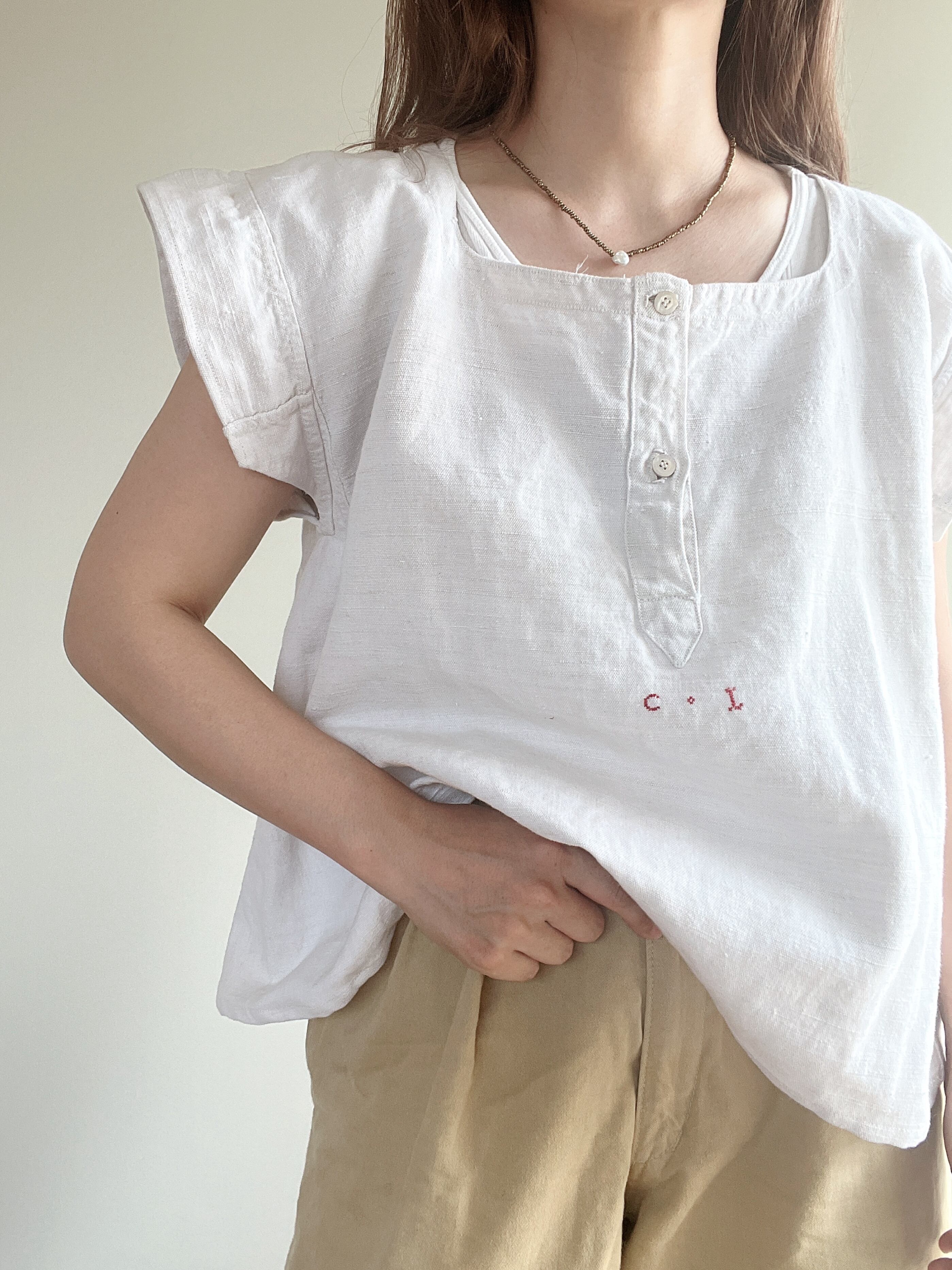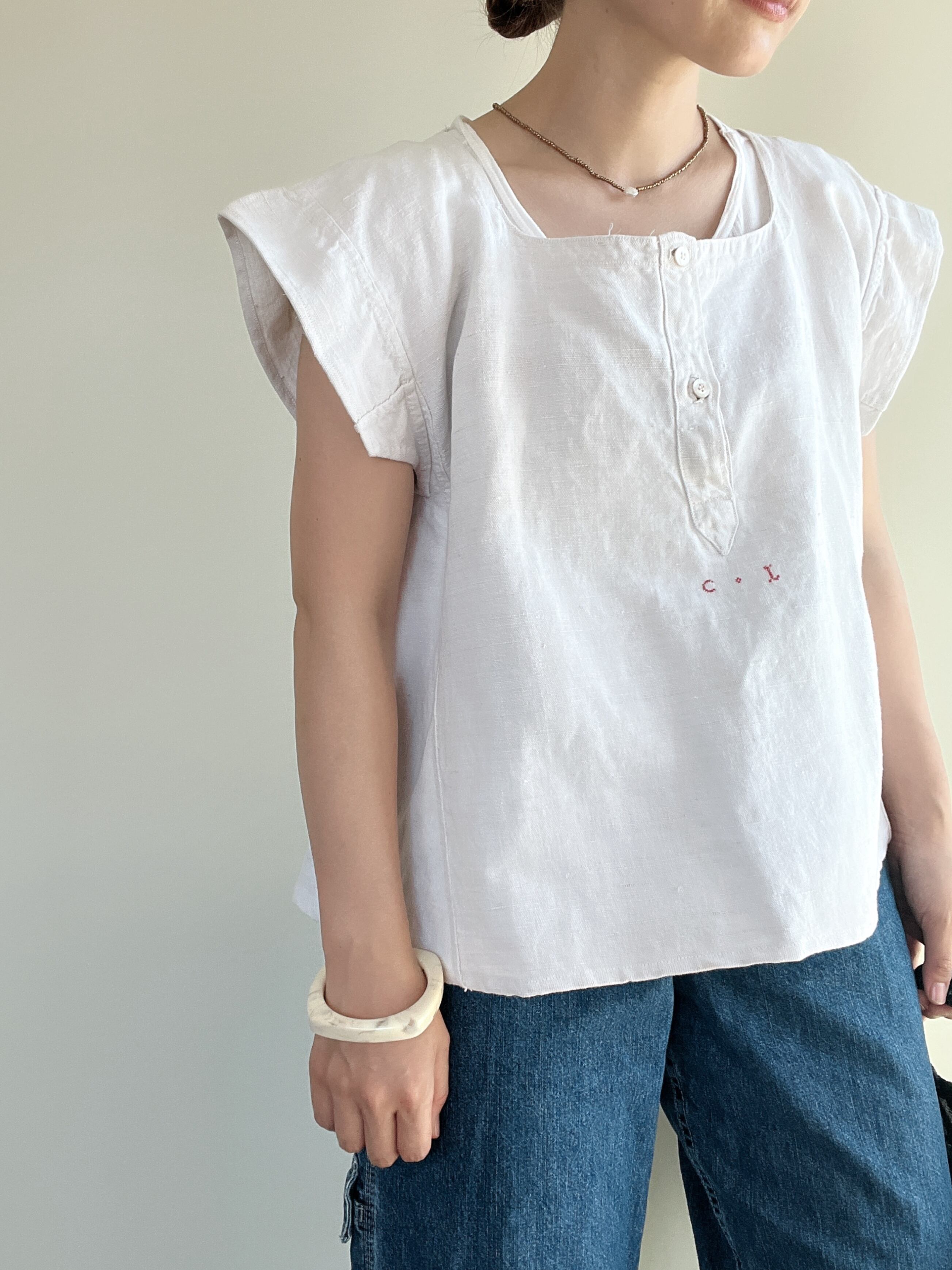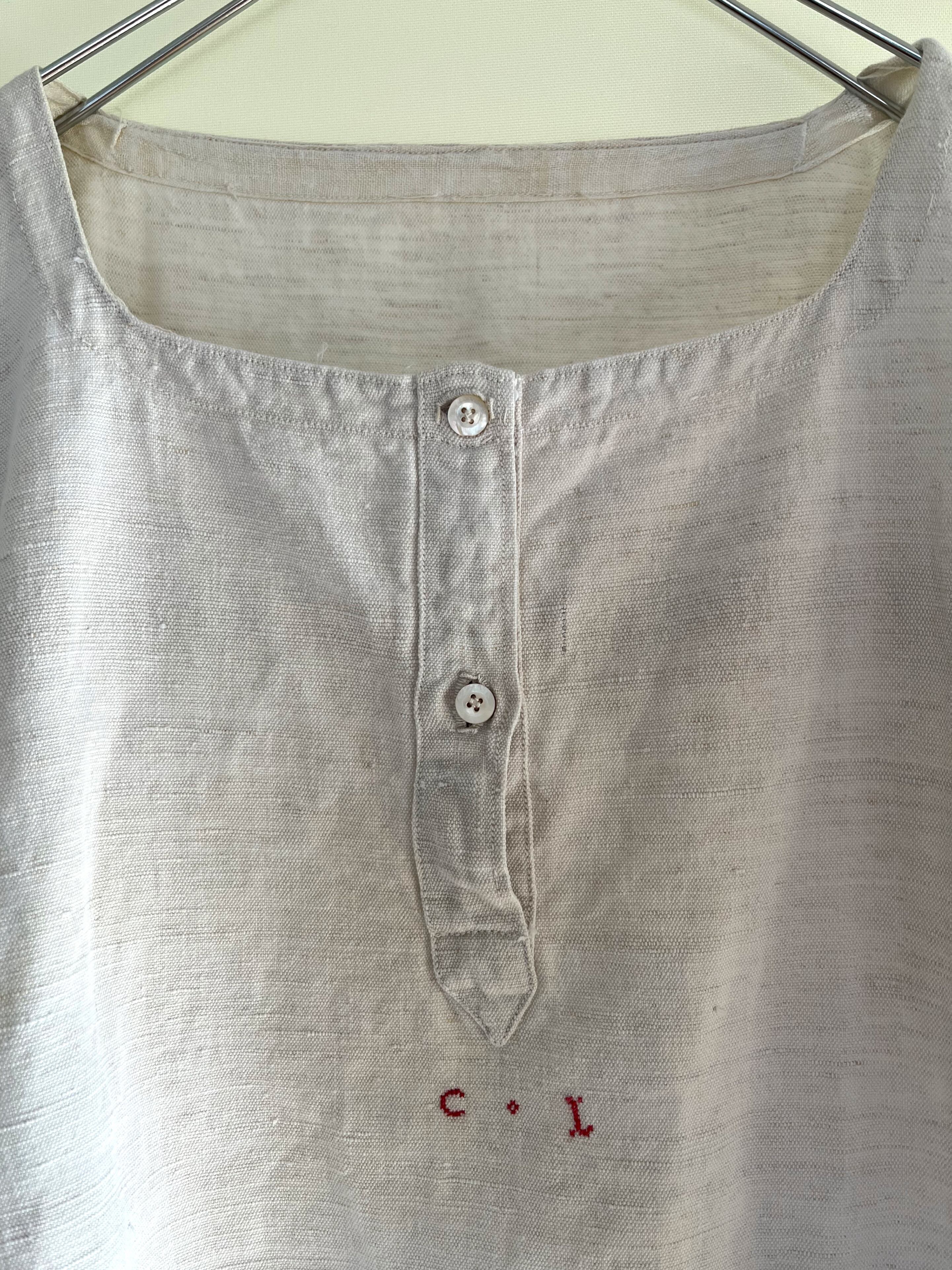 古いアンティークならではの生成色のくたっとしたリネンのワンピースだったもの、