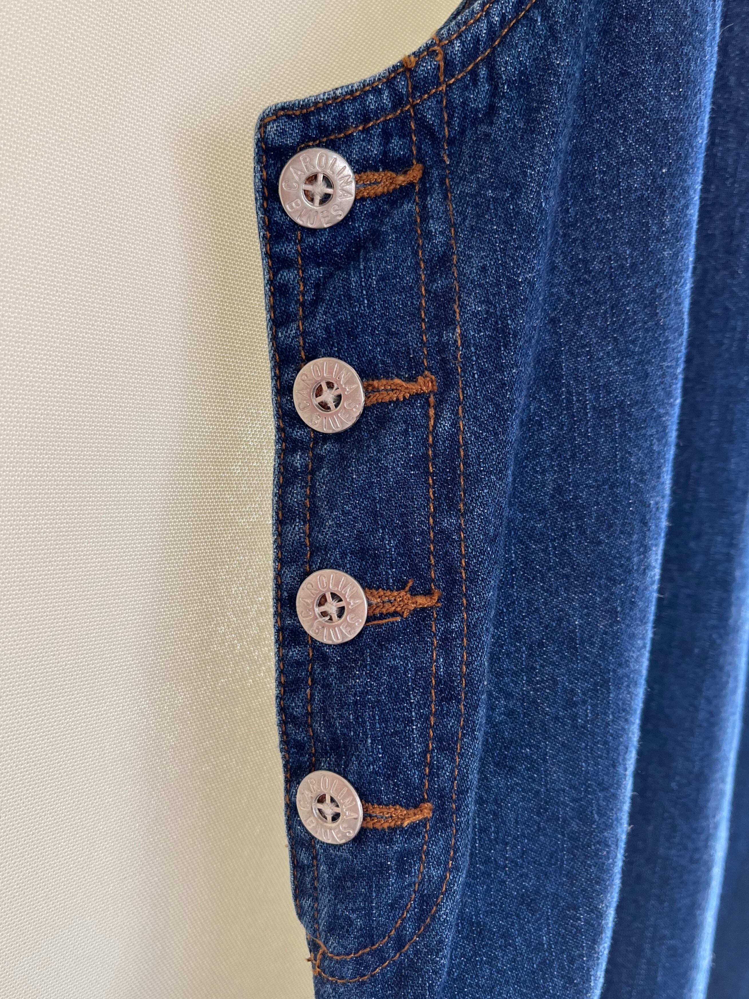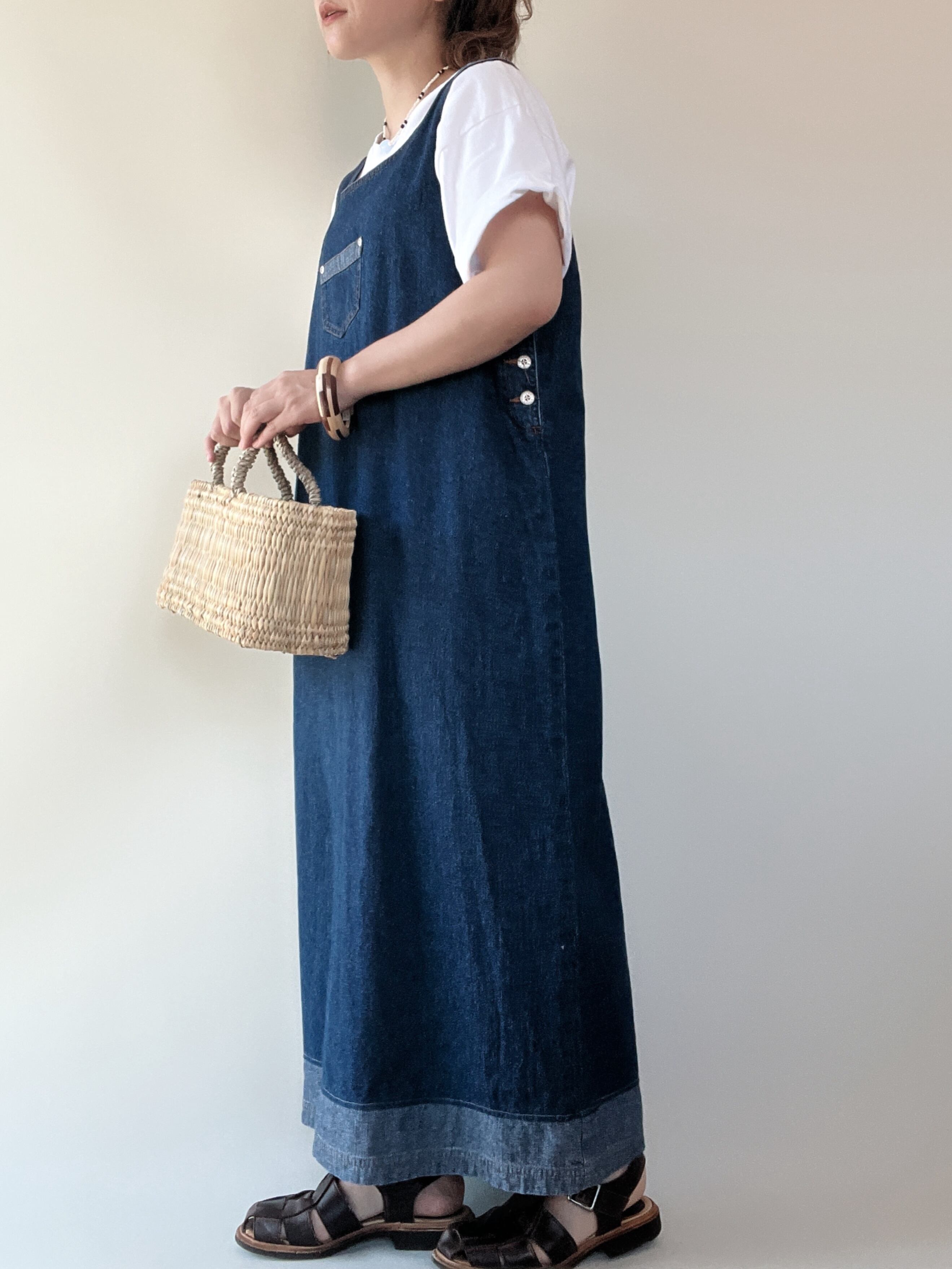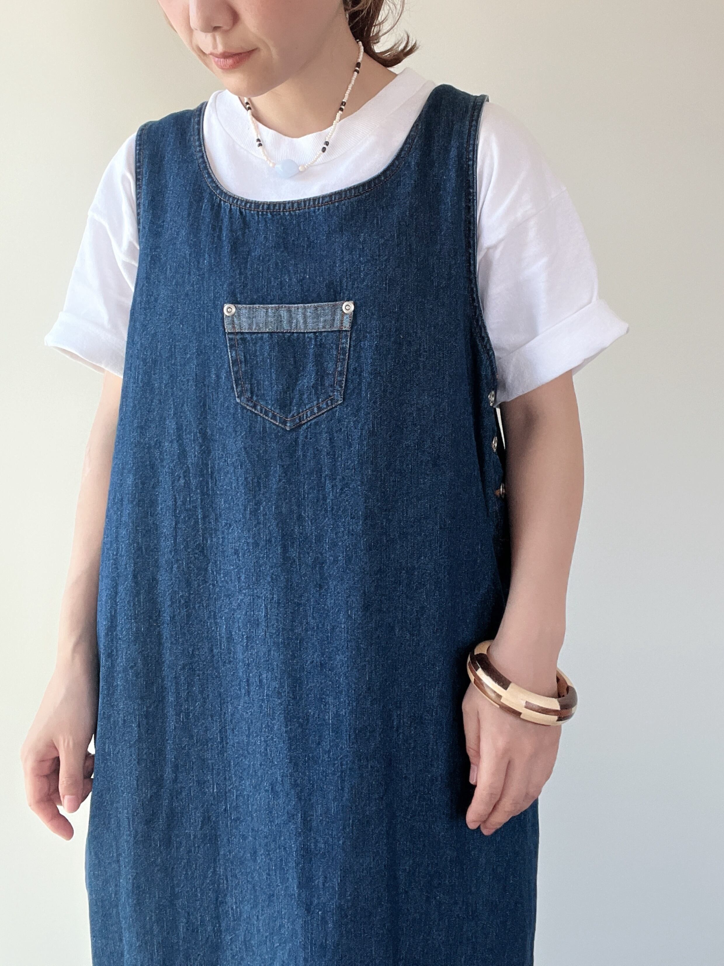 裾に淡いデニムの切り替え、胸に小さなポケットなど、古着らしい遊び心あるデザインも兼ね備え,