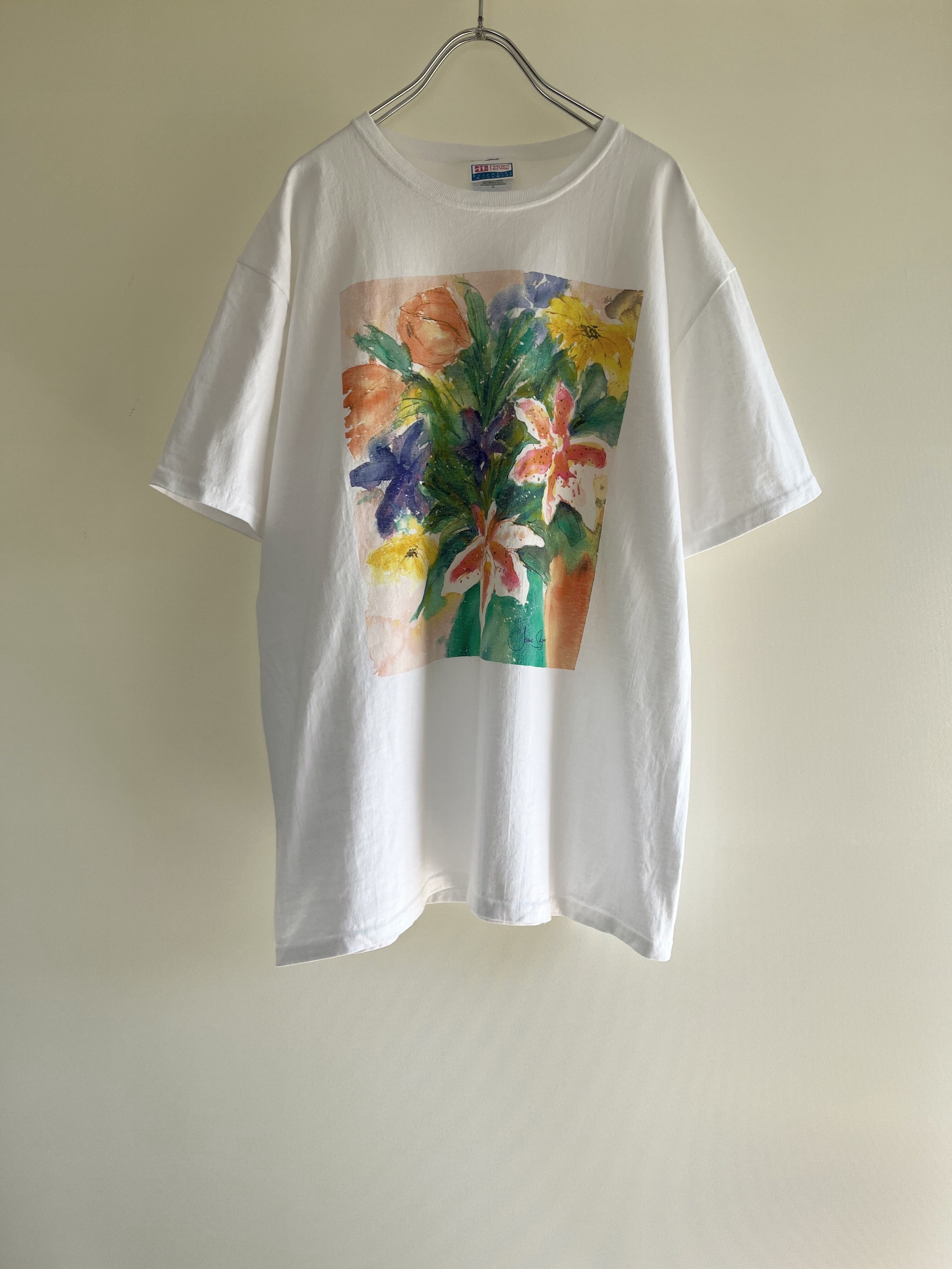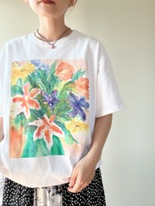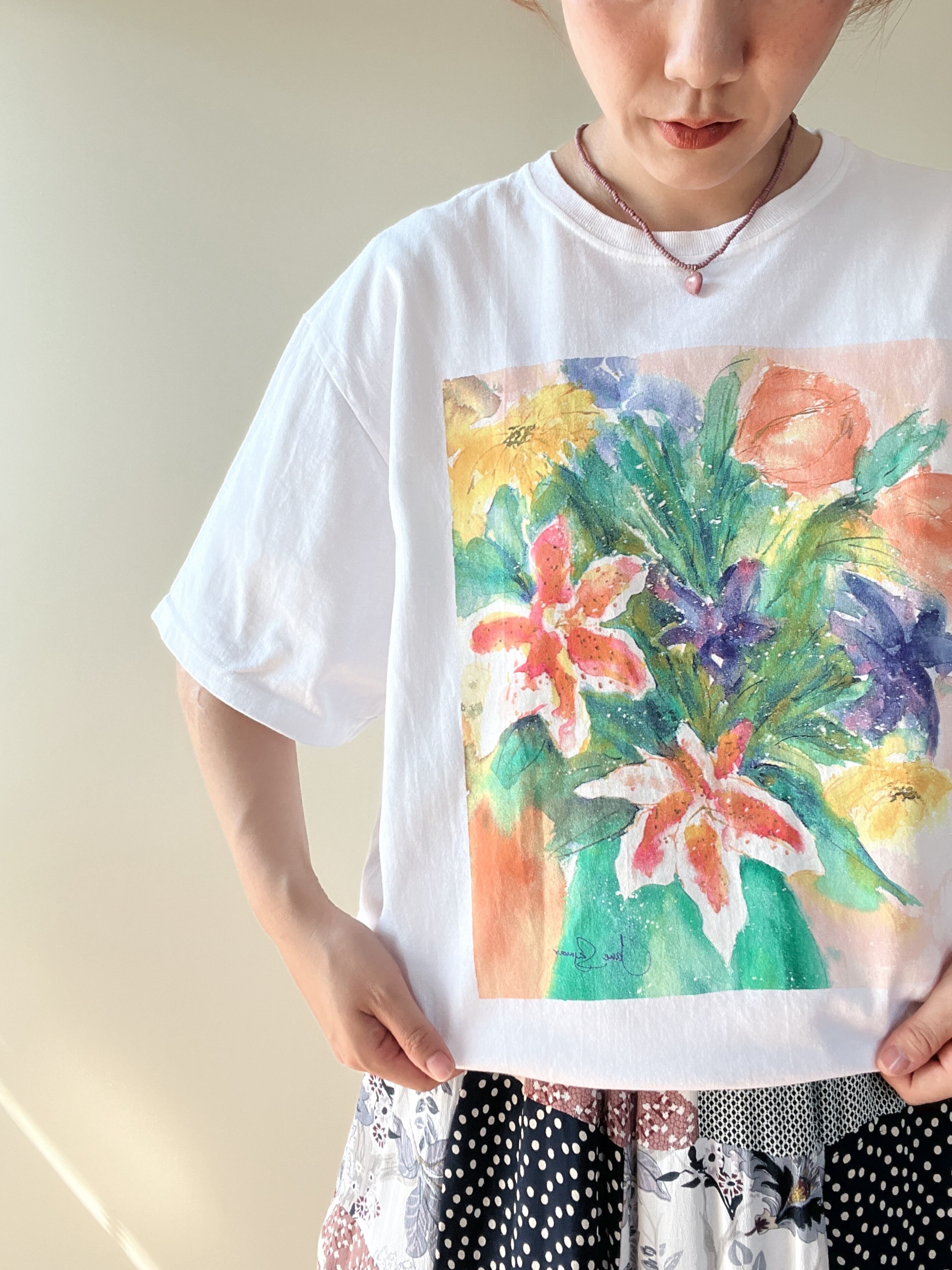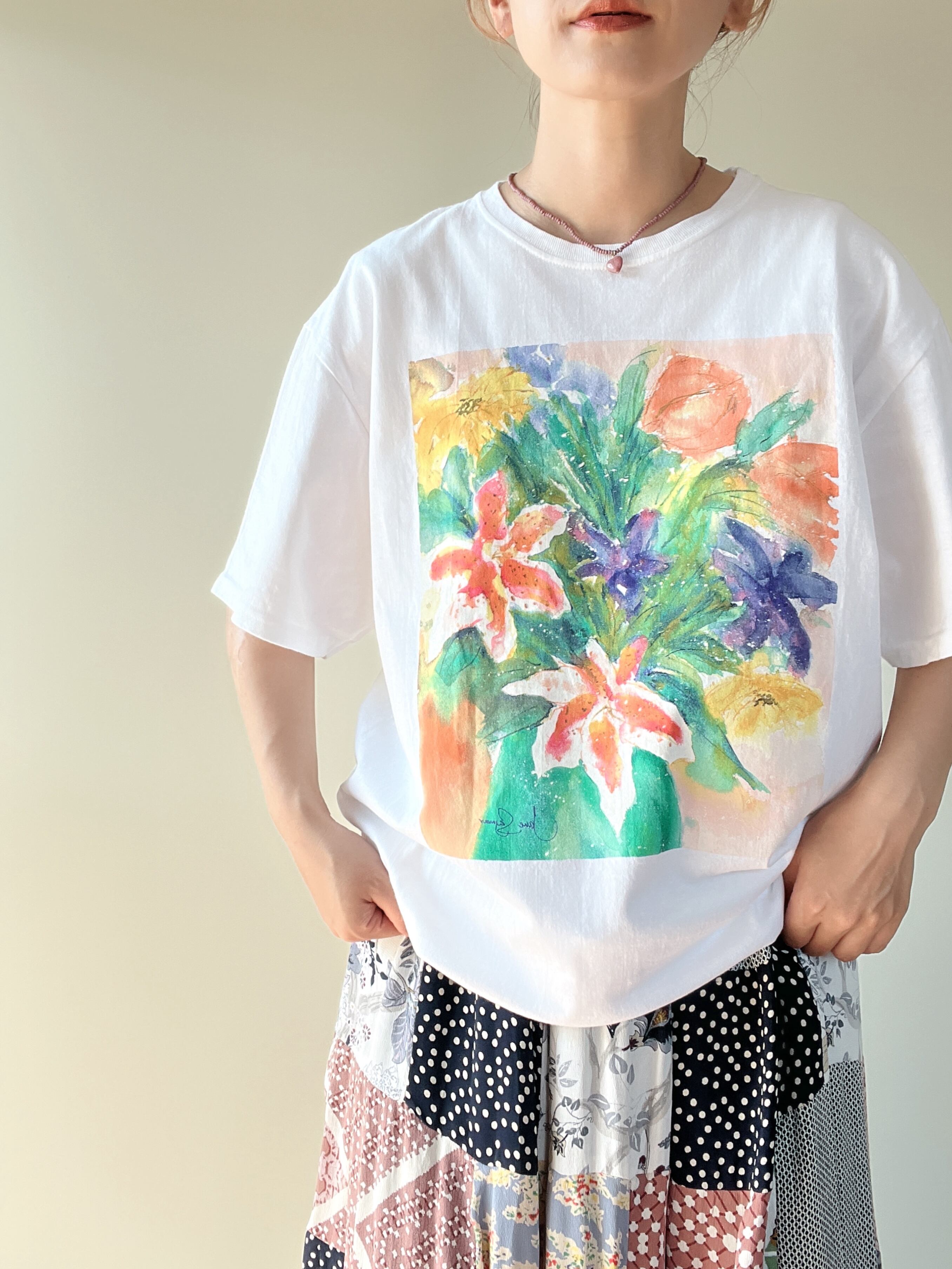 存在感のある水彩画のような花のプリントが魅力的なホワイトTシャツです。