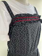 胸には細かなフリル、赤いテープが縫い付けてあり,