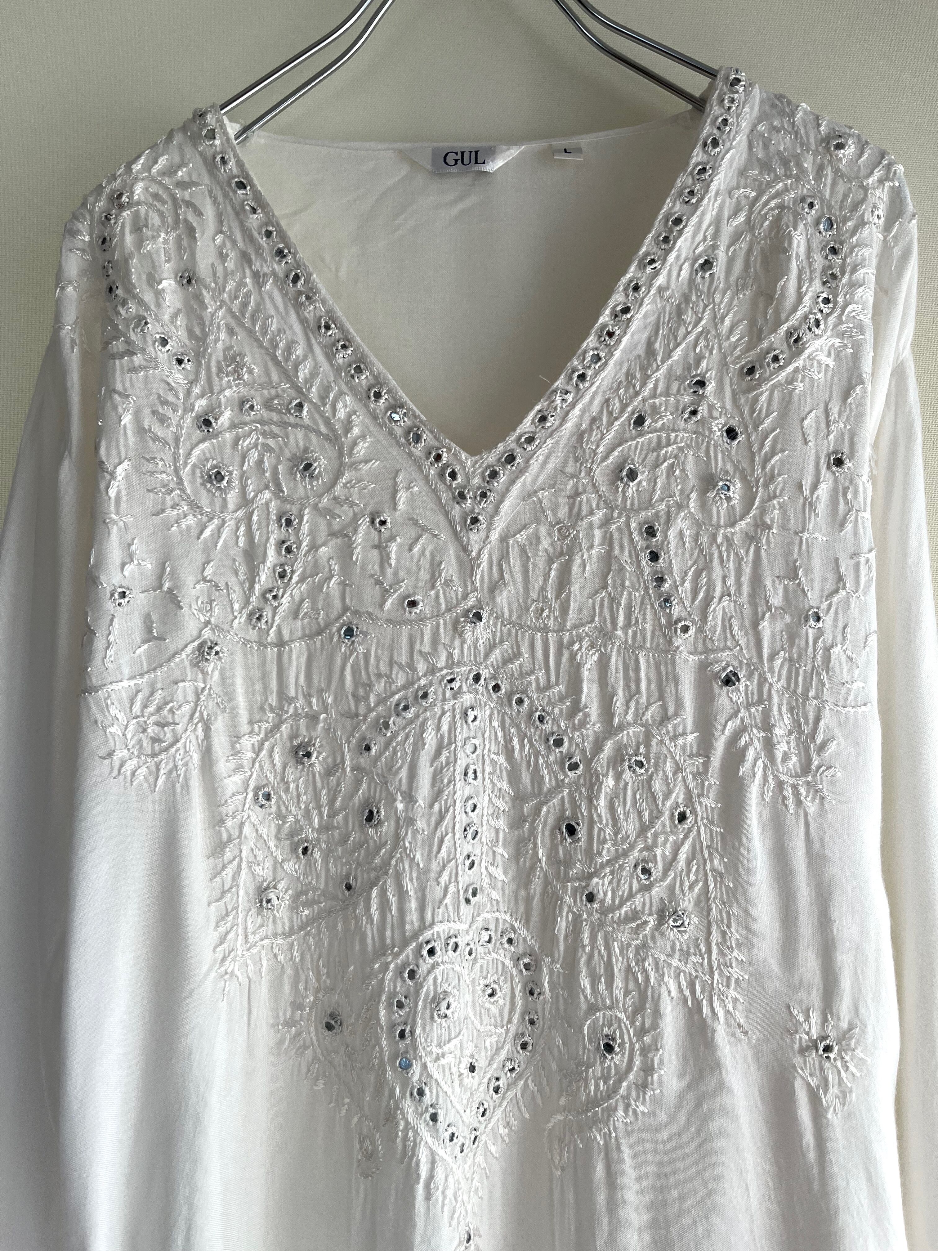 刺繍にはところどころに小さなミラーが縫い込まれており、