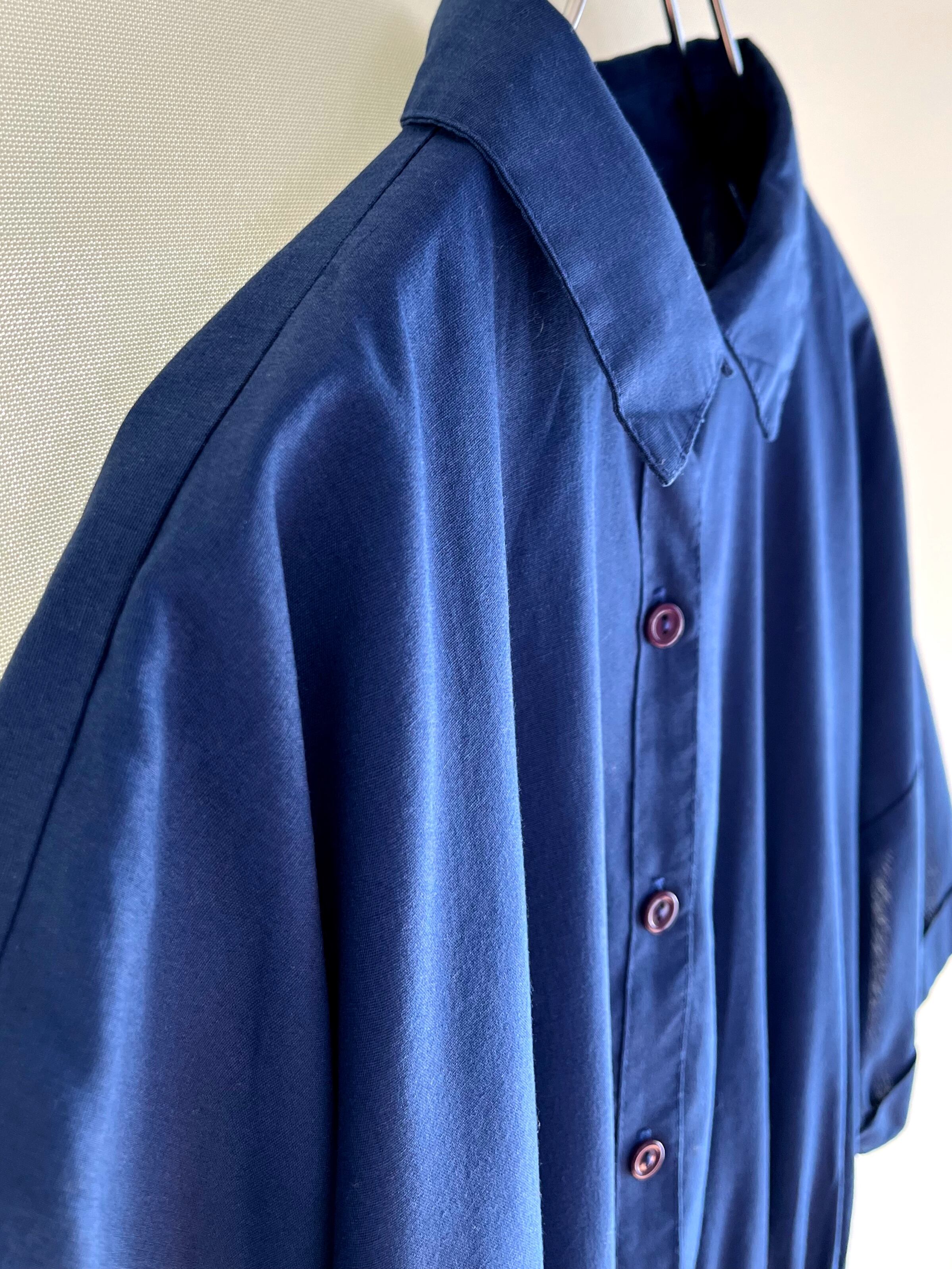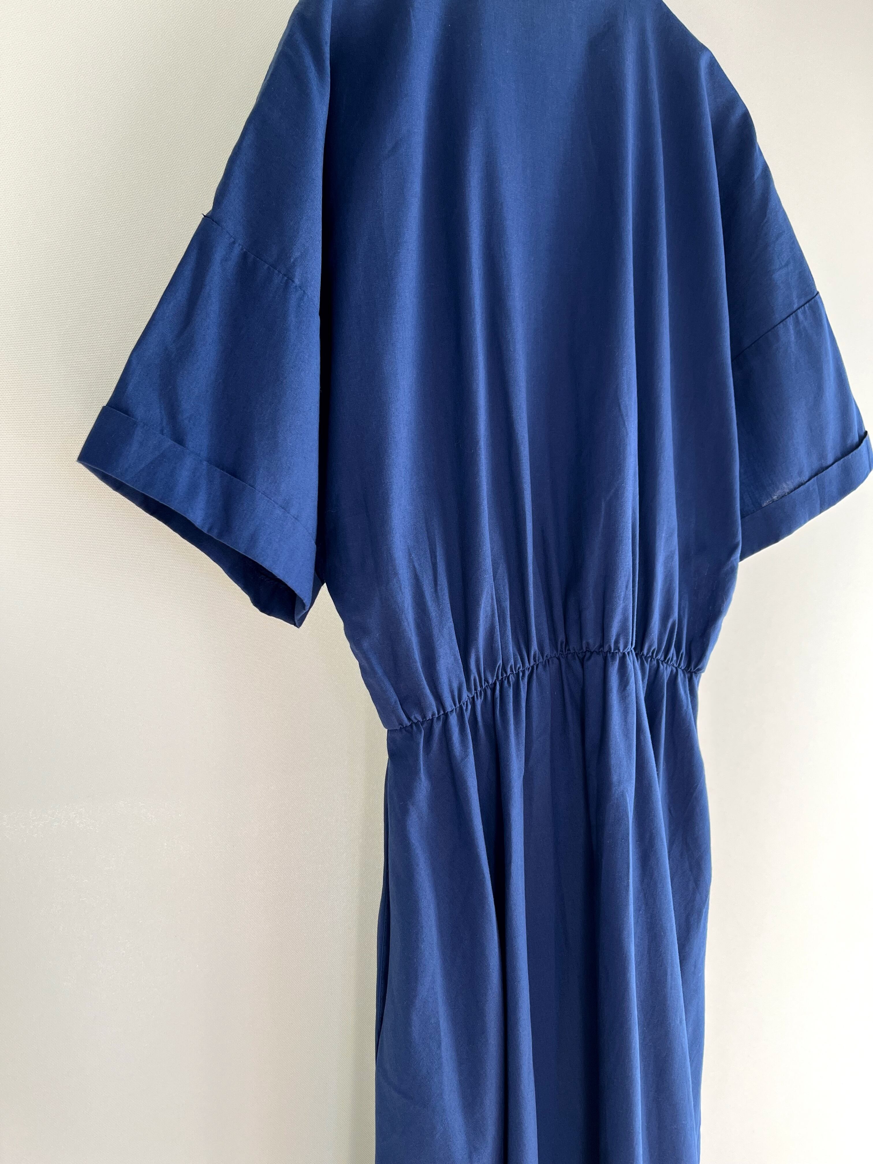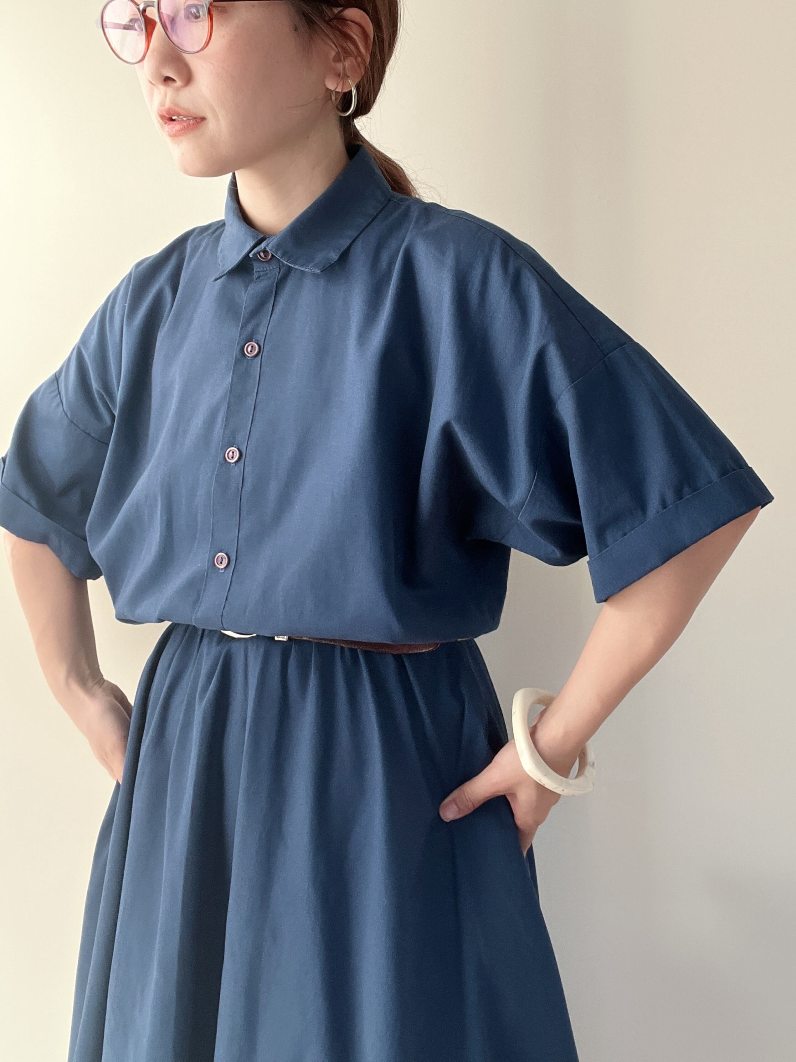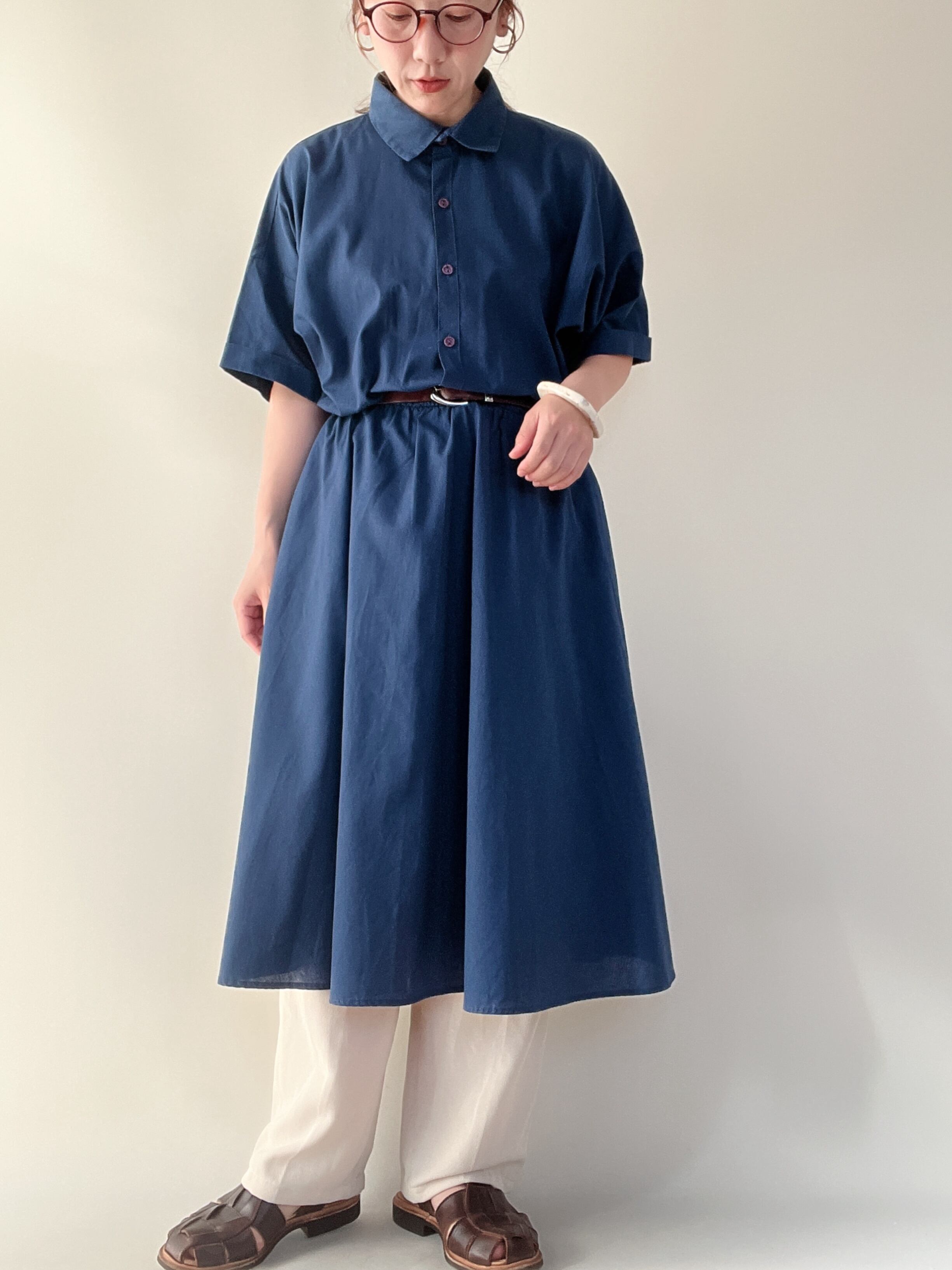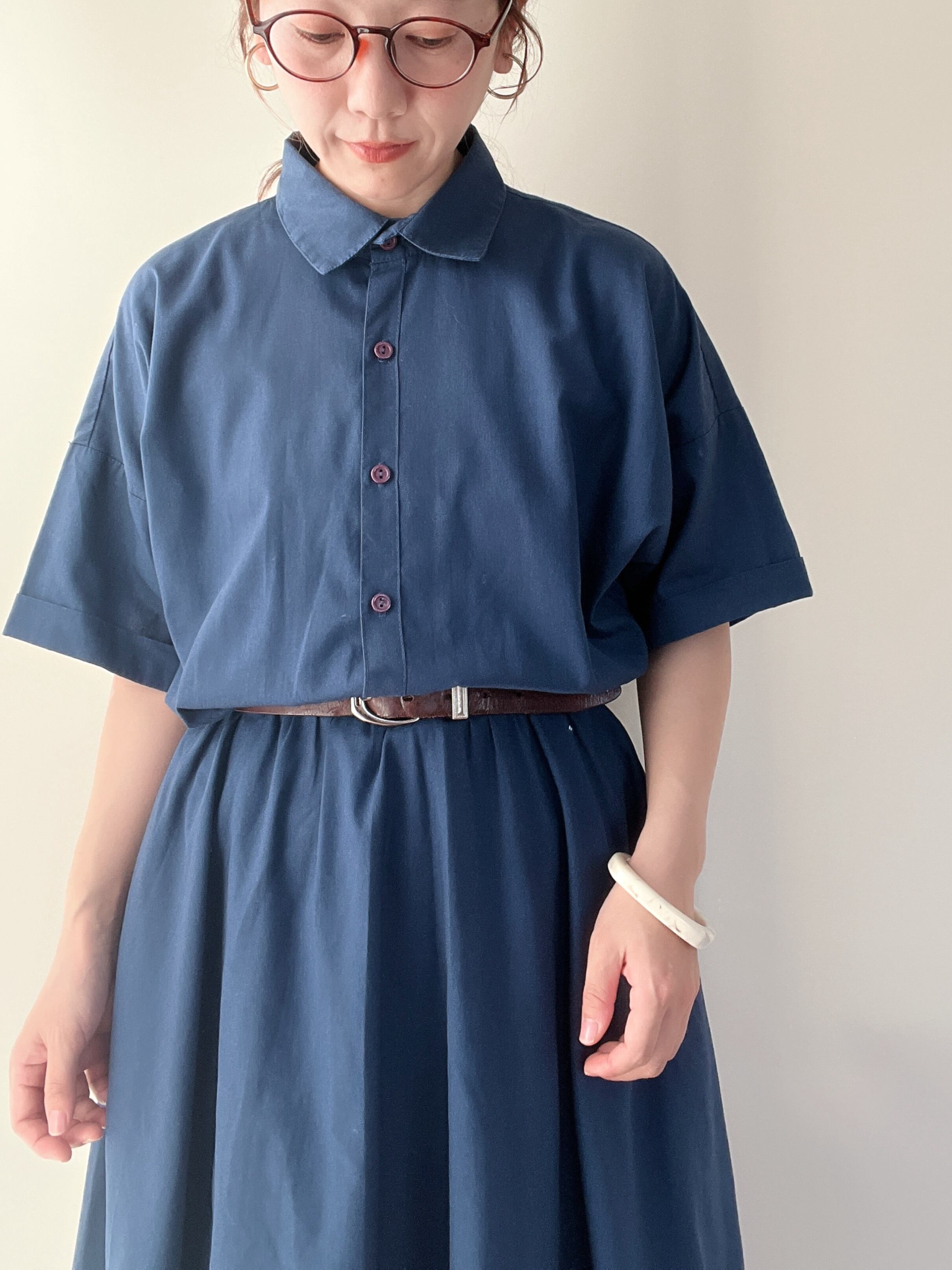 小さめのラベンダー色ボタンがおへそあたりまでついており、
