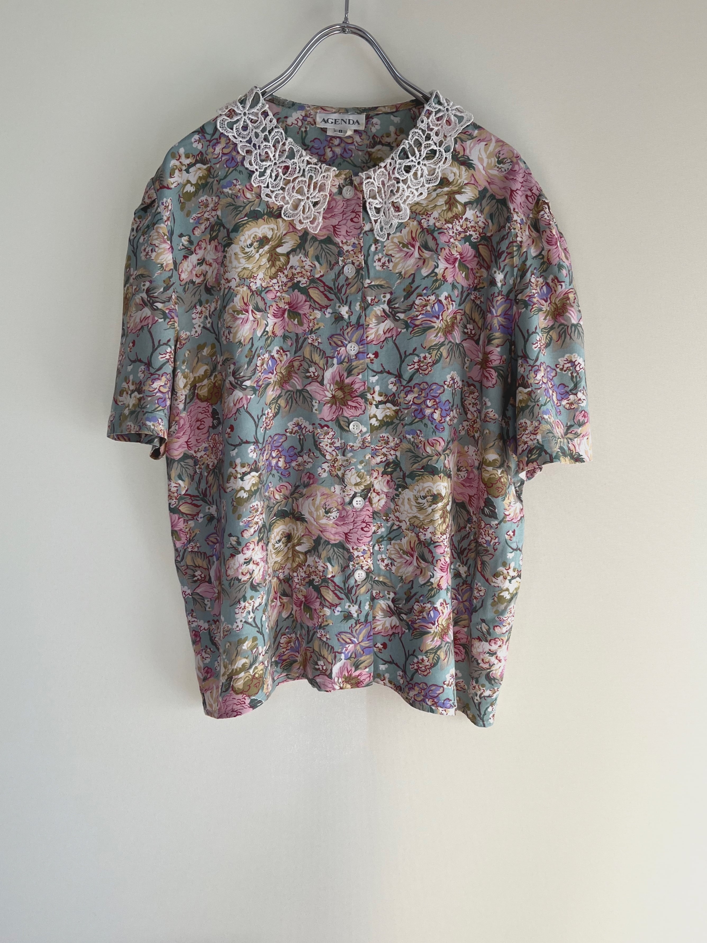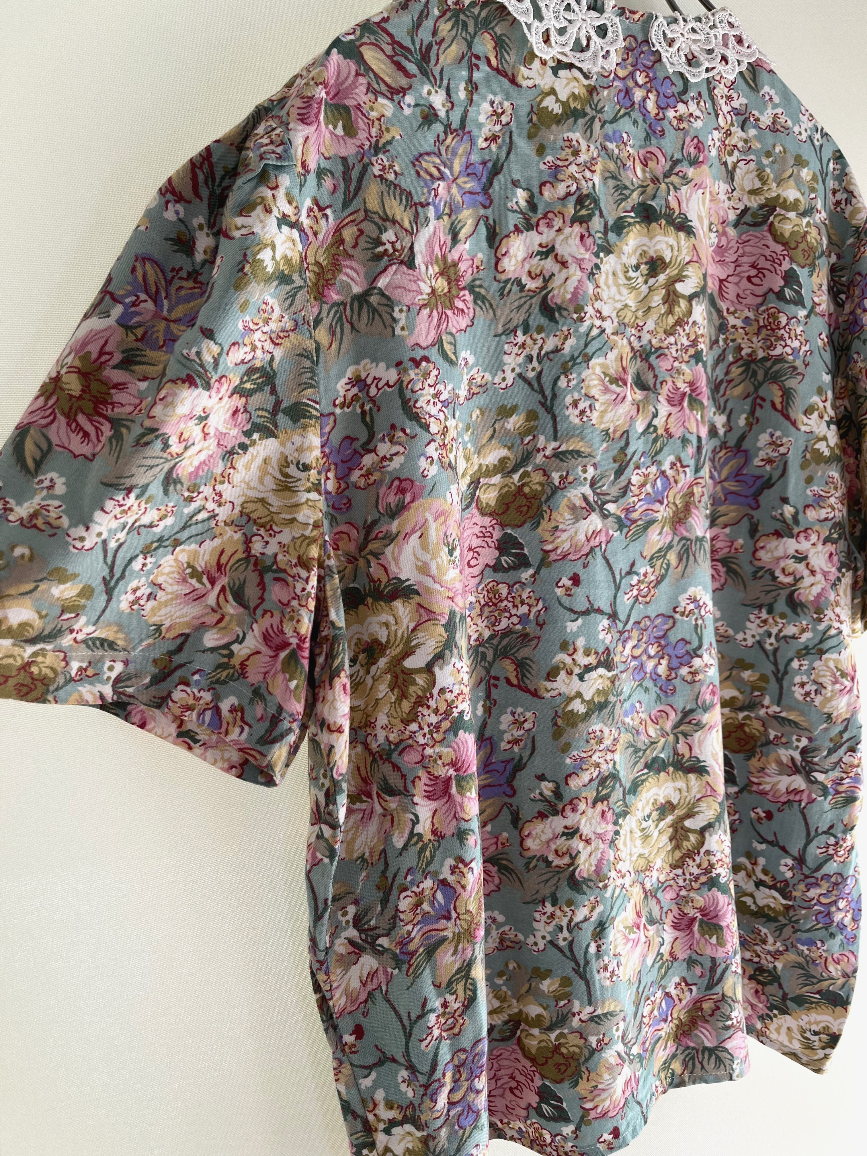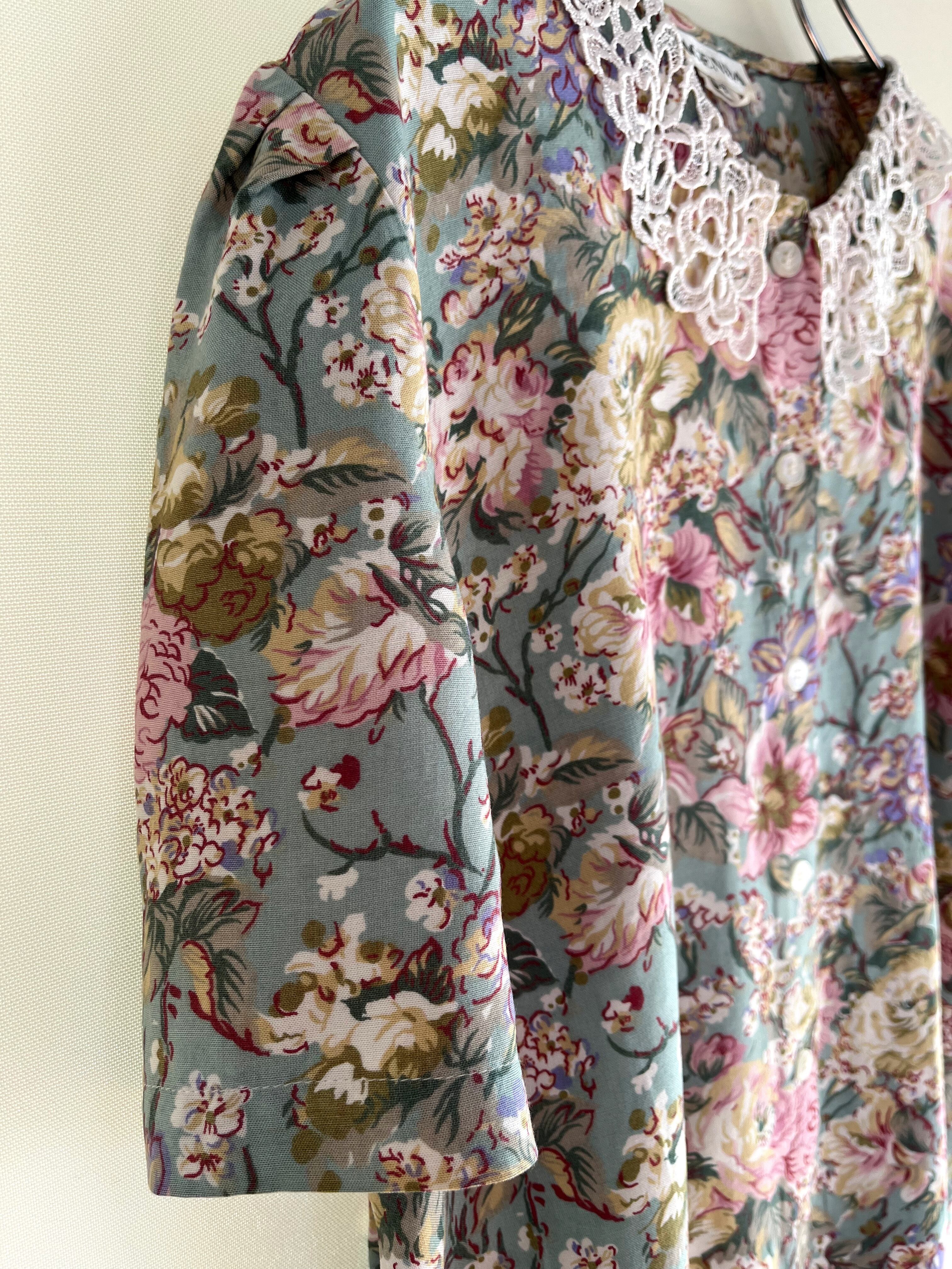 ベージュやくすみピンク色の手描きのテキスタイルが魅力的なレーヨン素材のブラウスです。