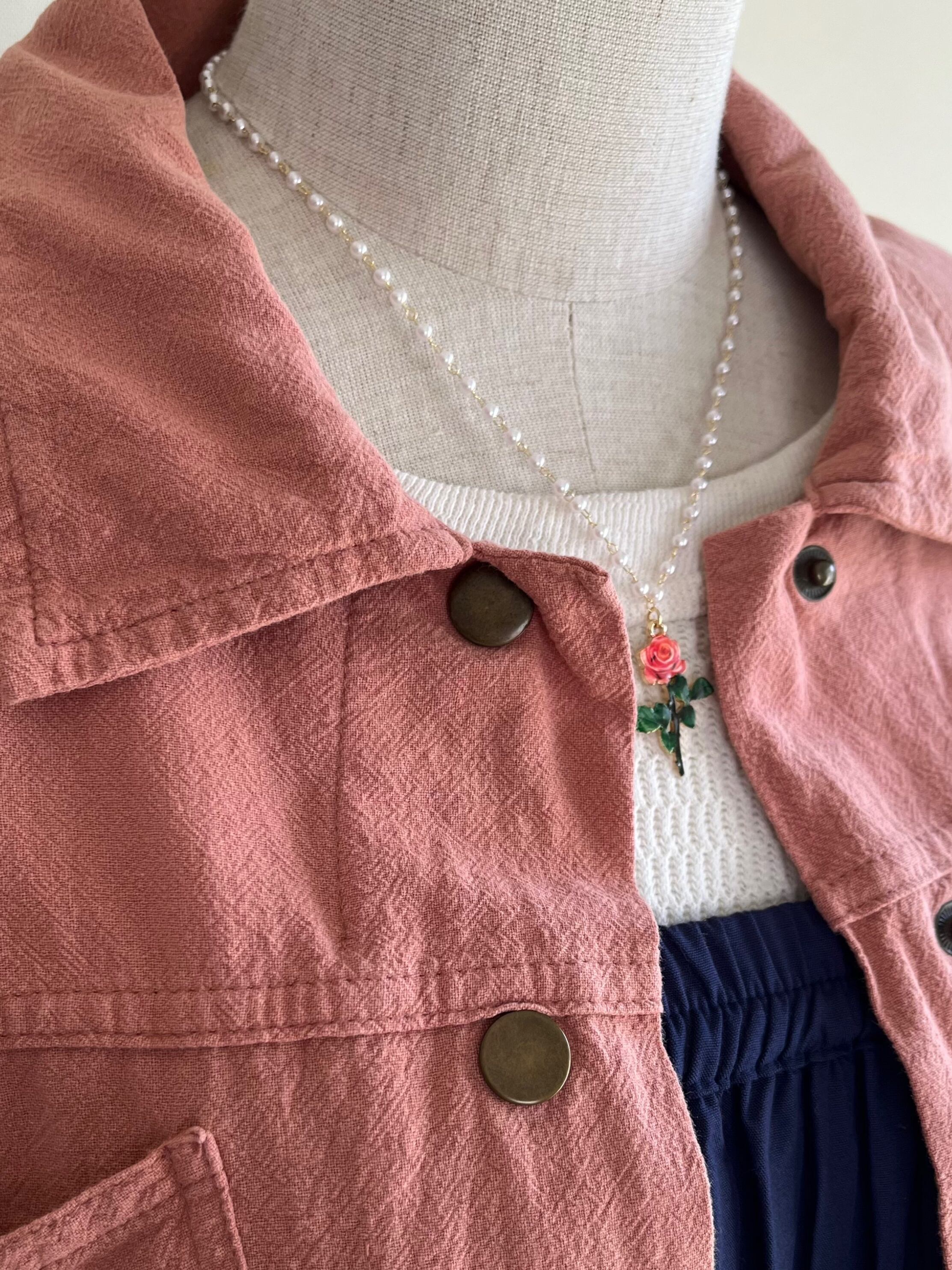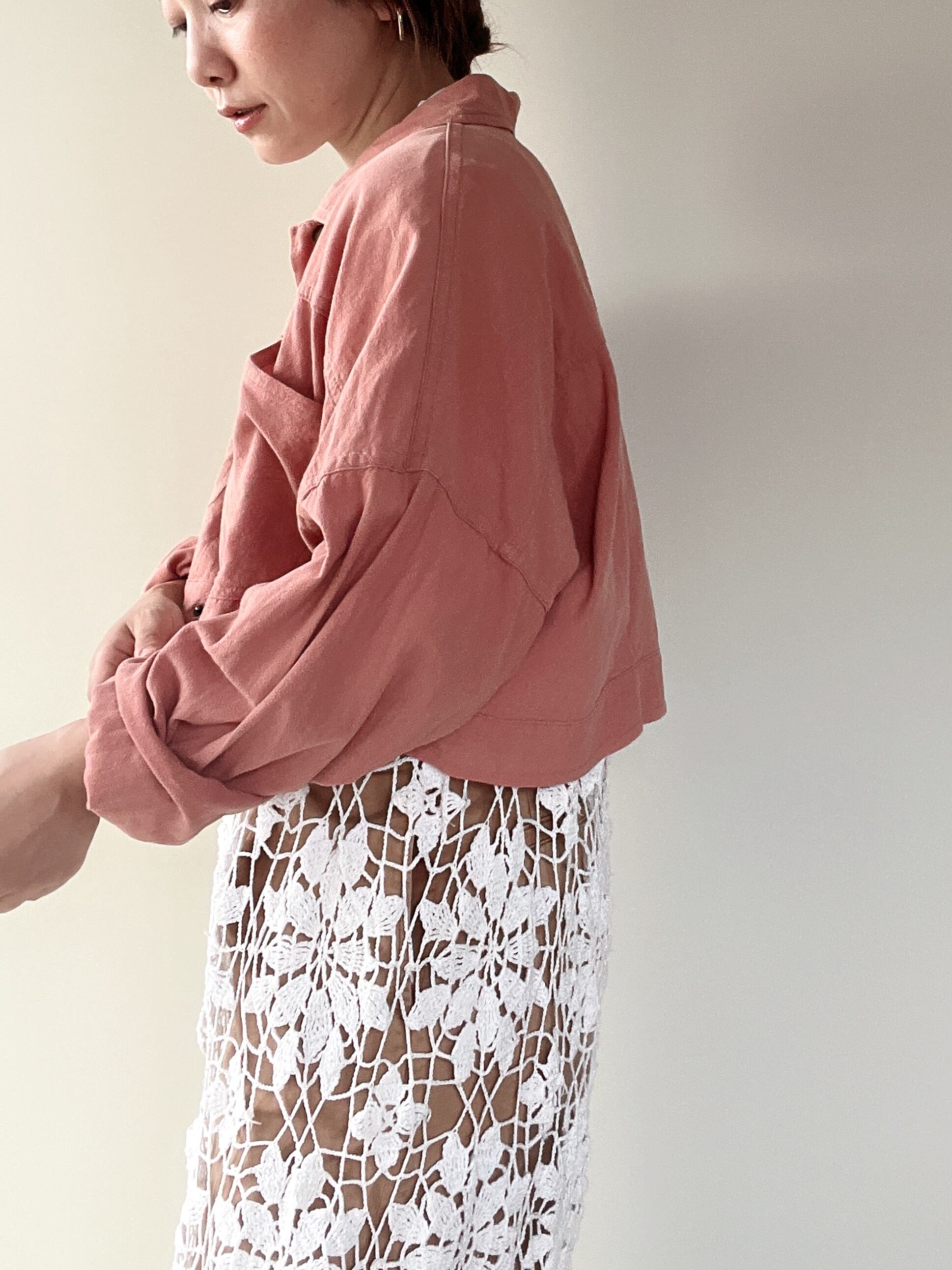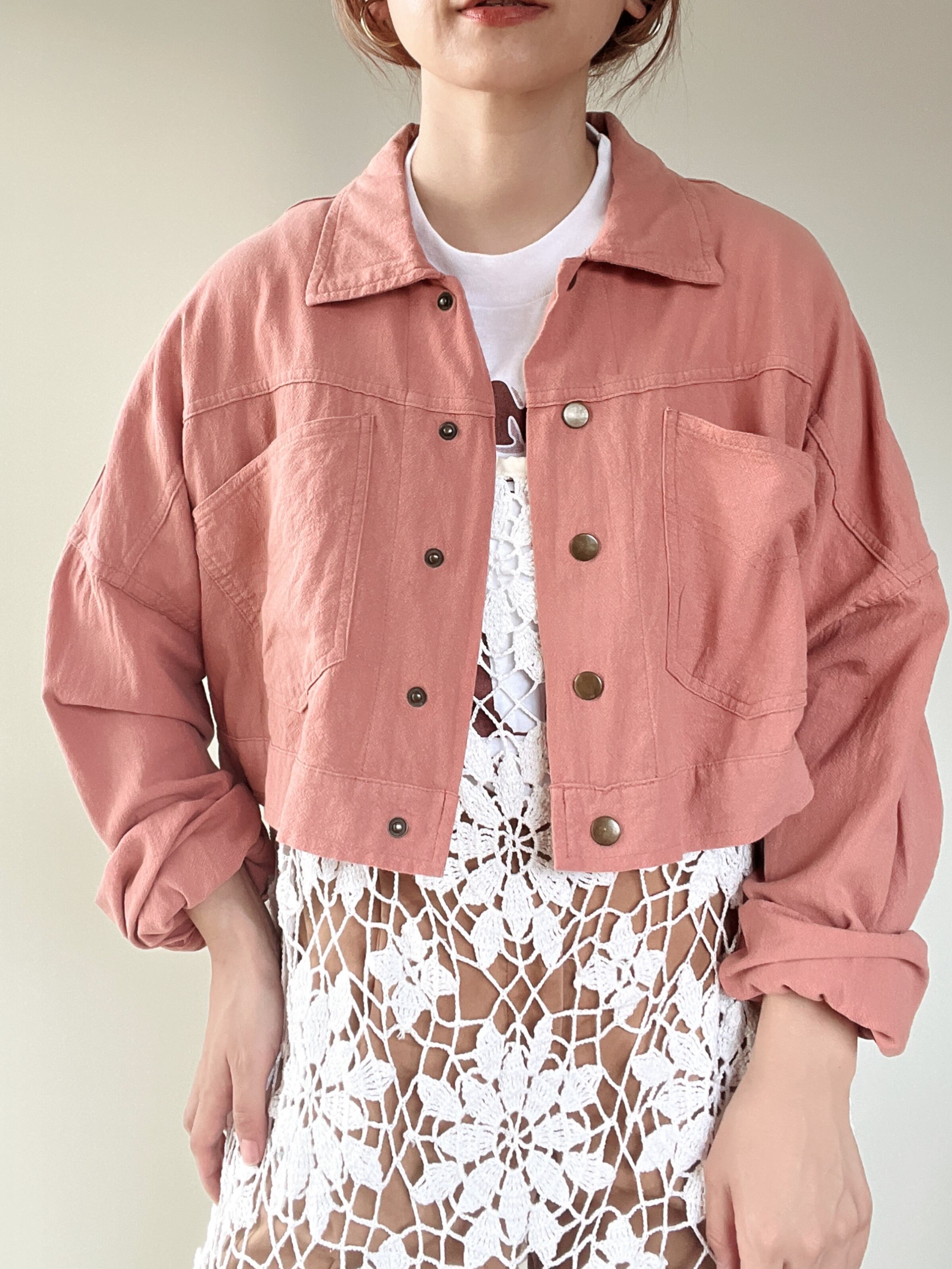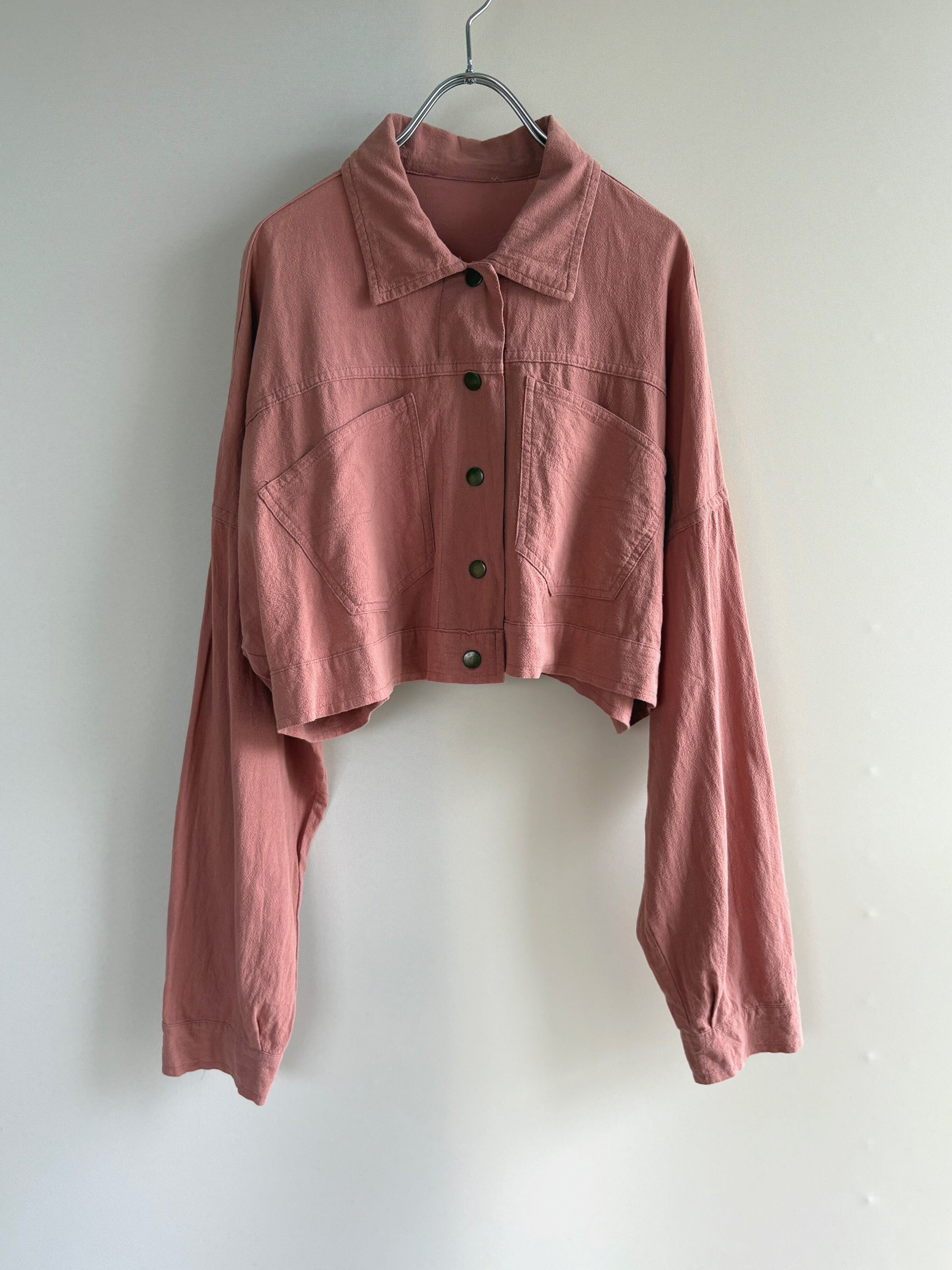 くすんだピンク色の柔らかなショート丈ジャケットです。