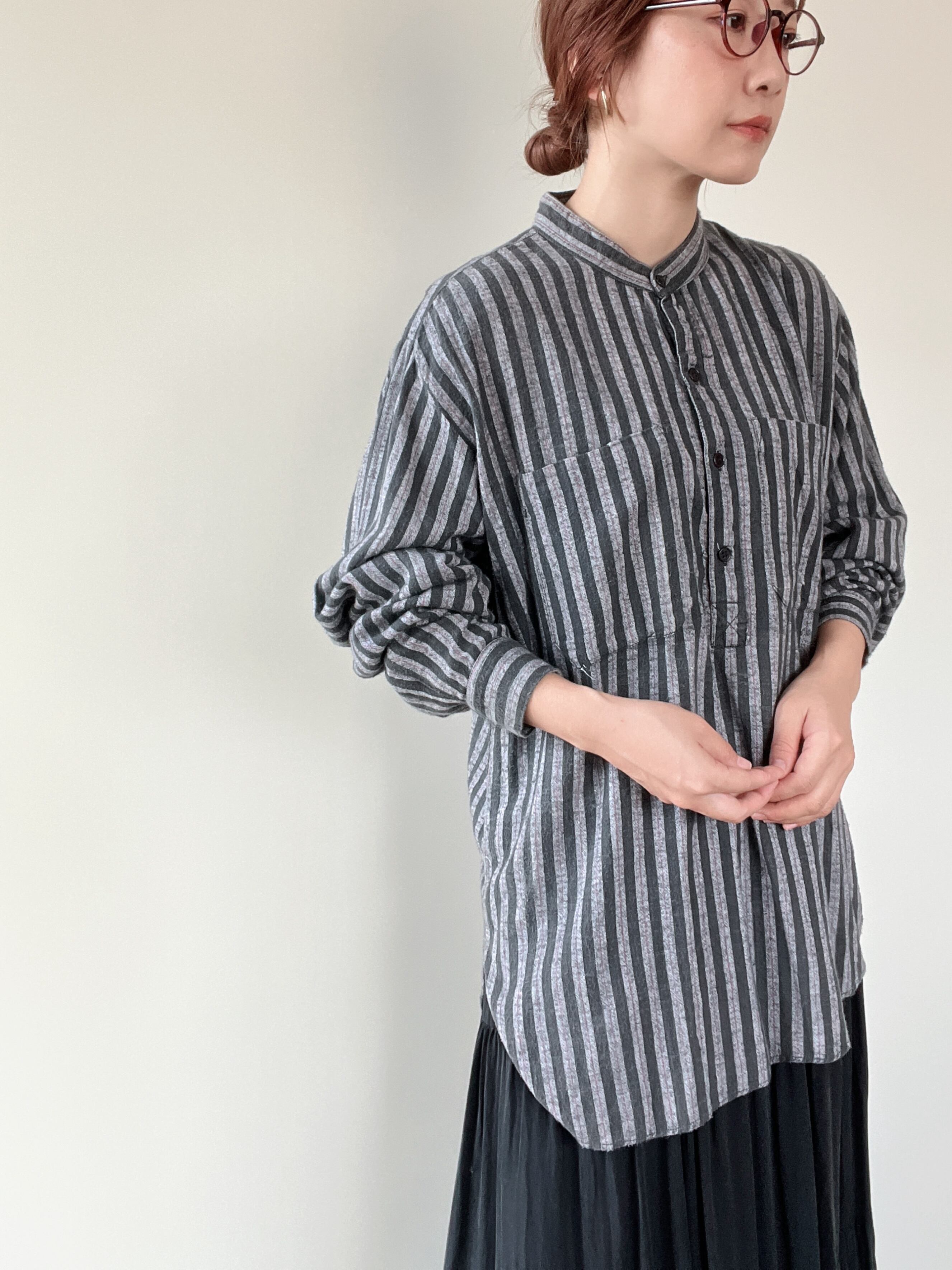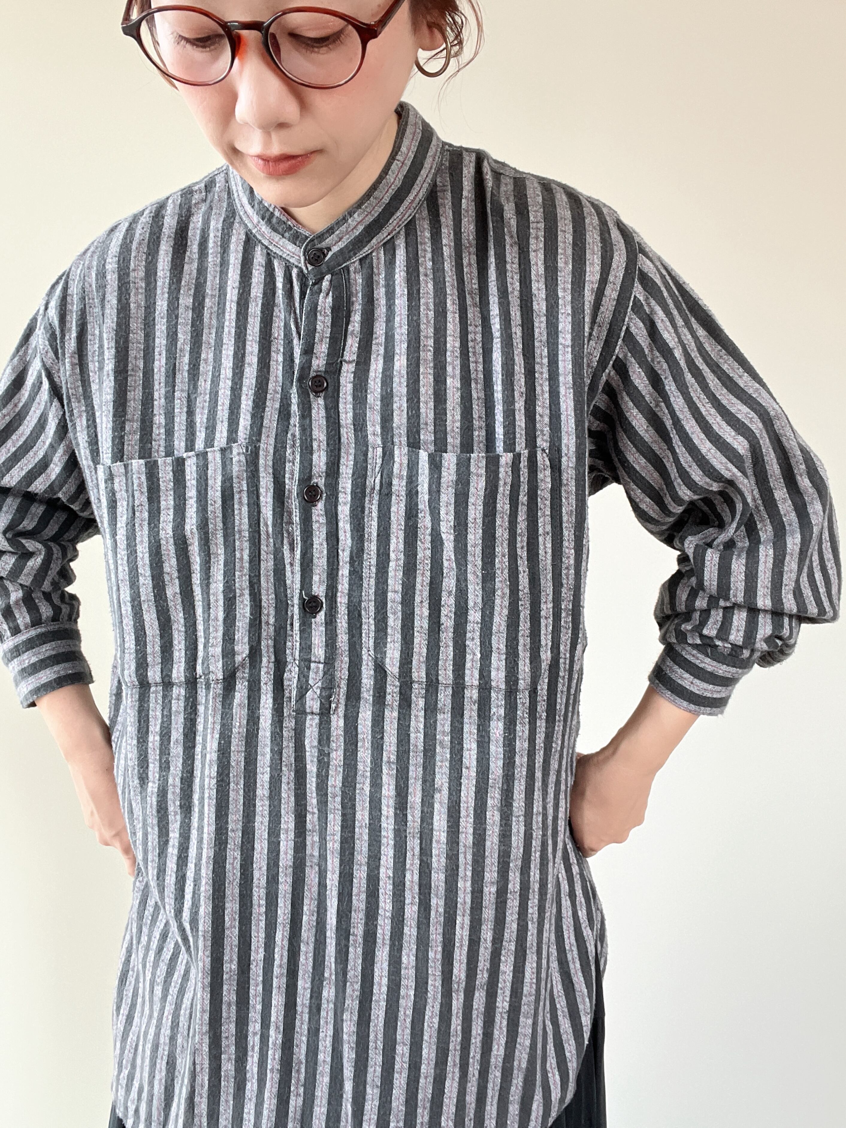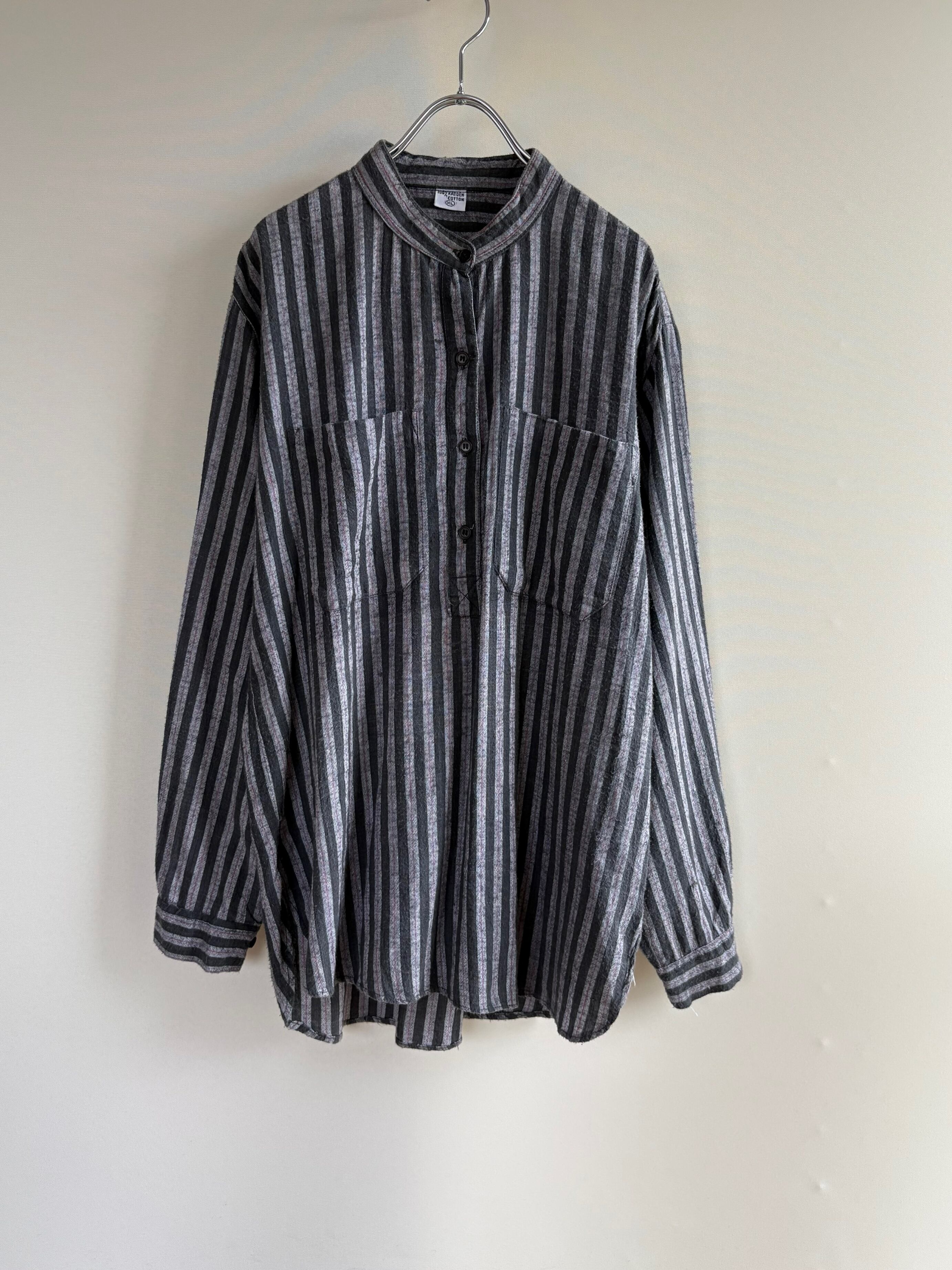ストライプ柄スタンドカラーのプルオーバーシャツです。