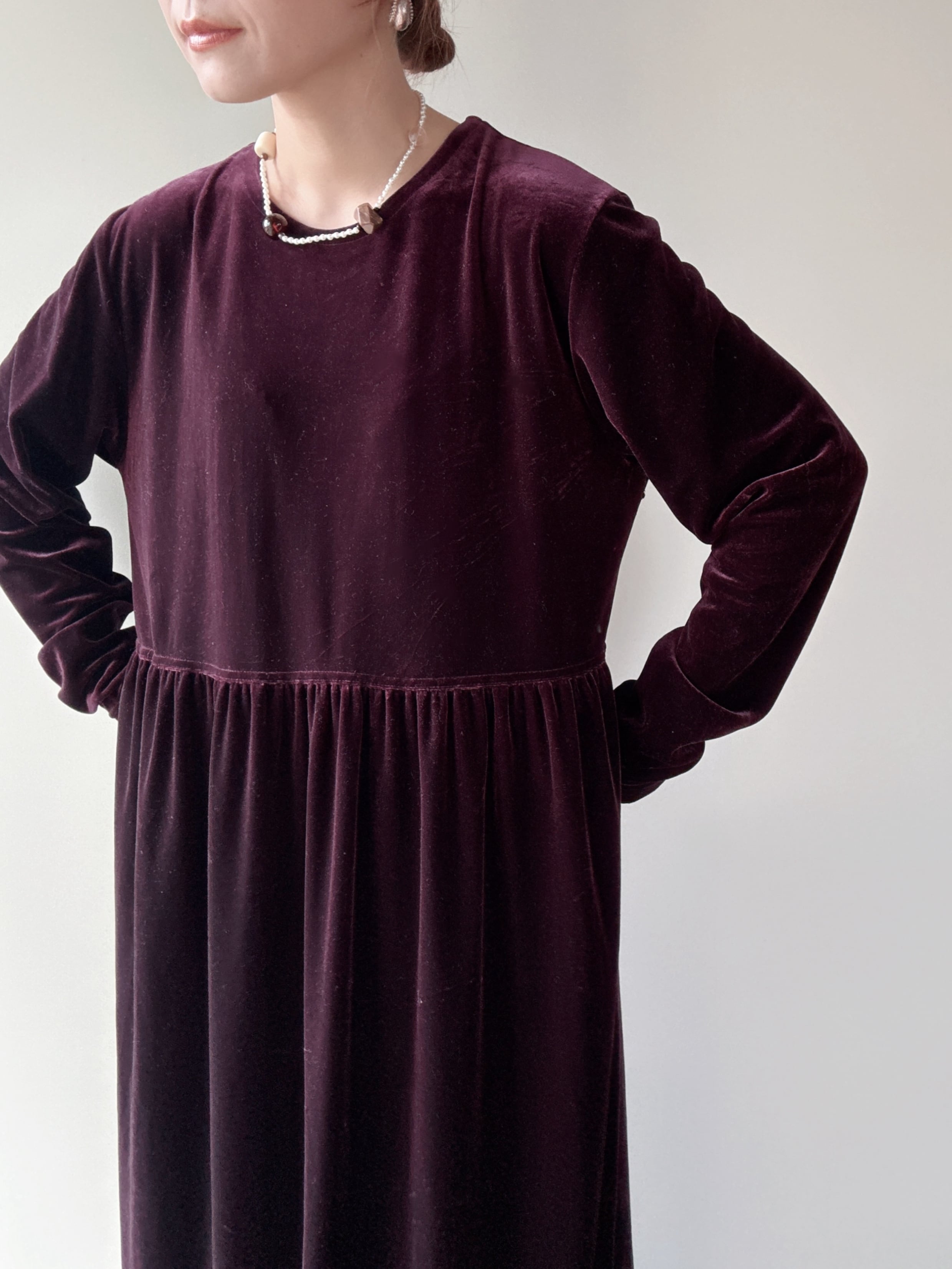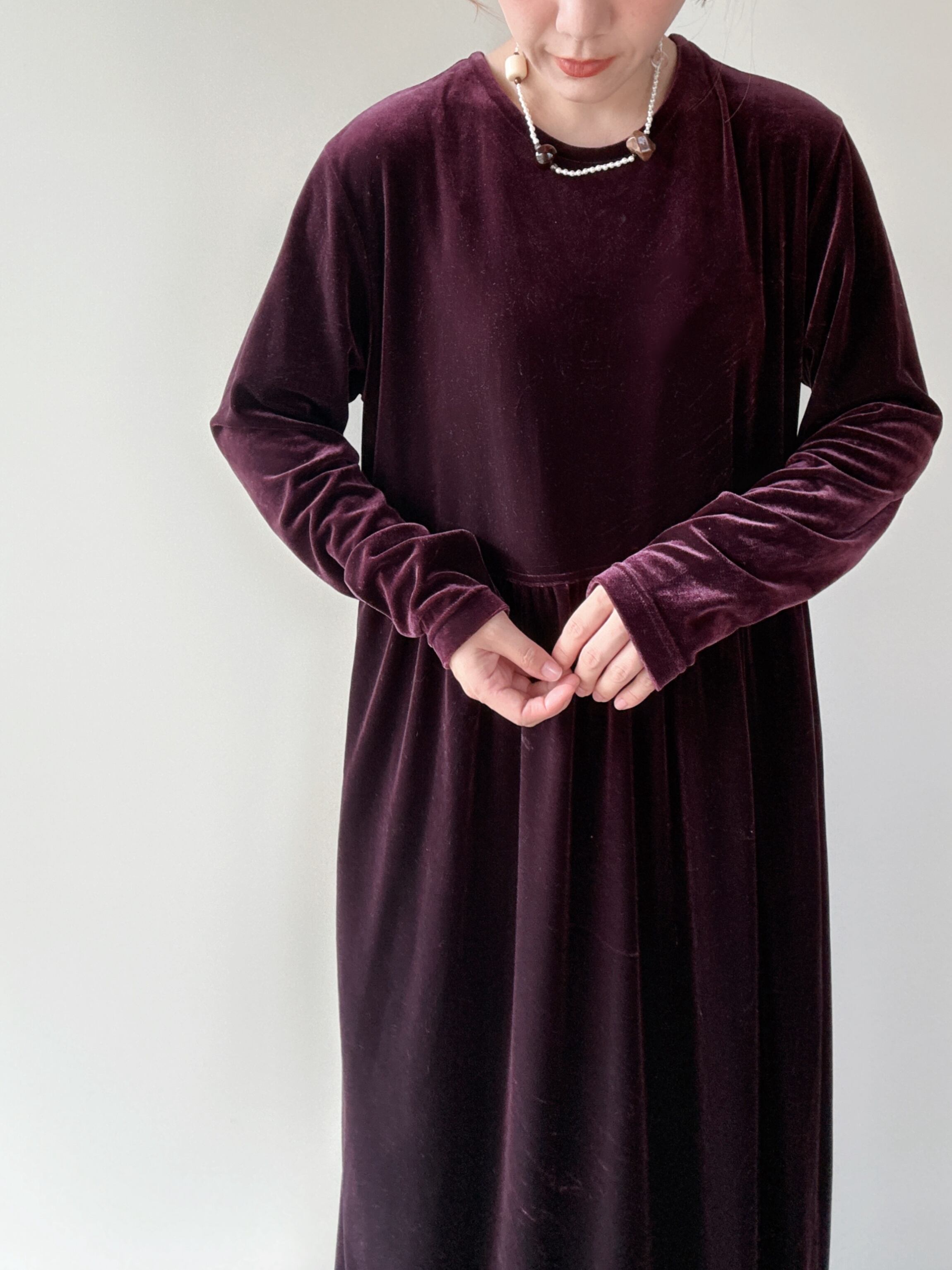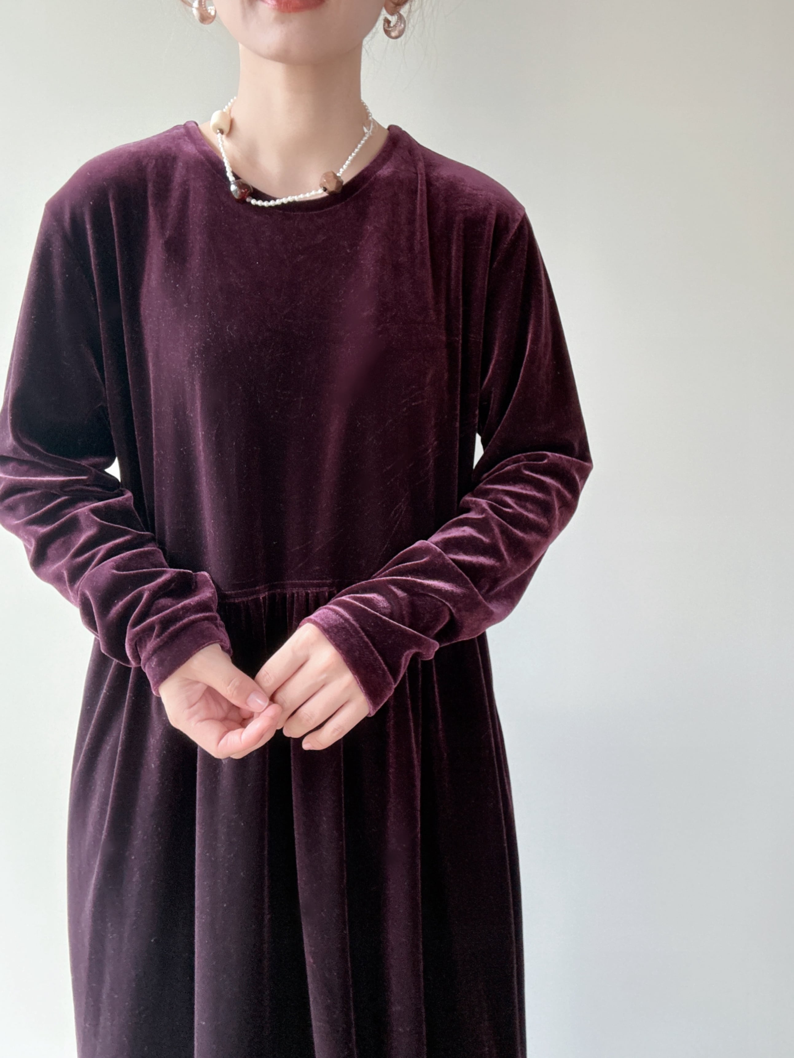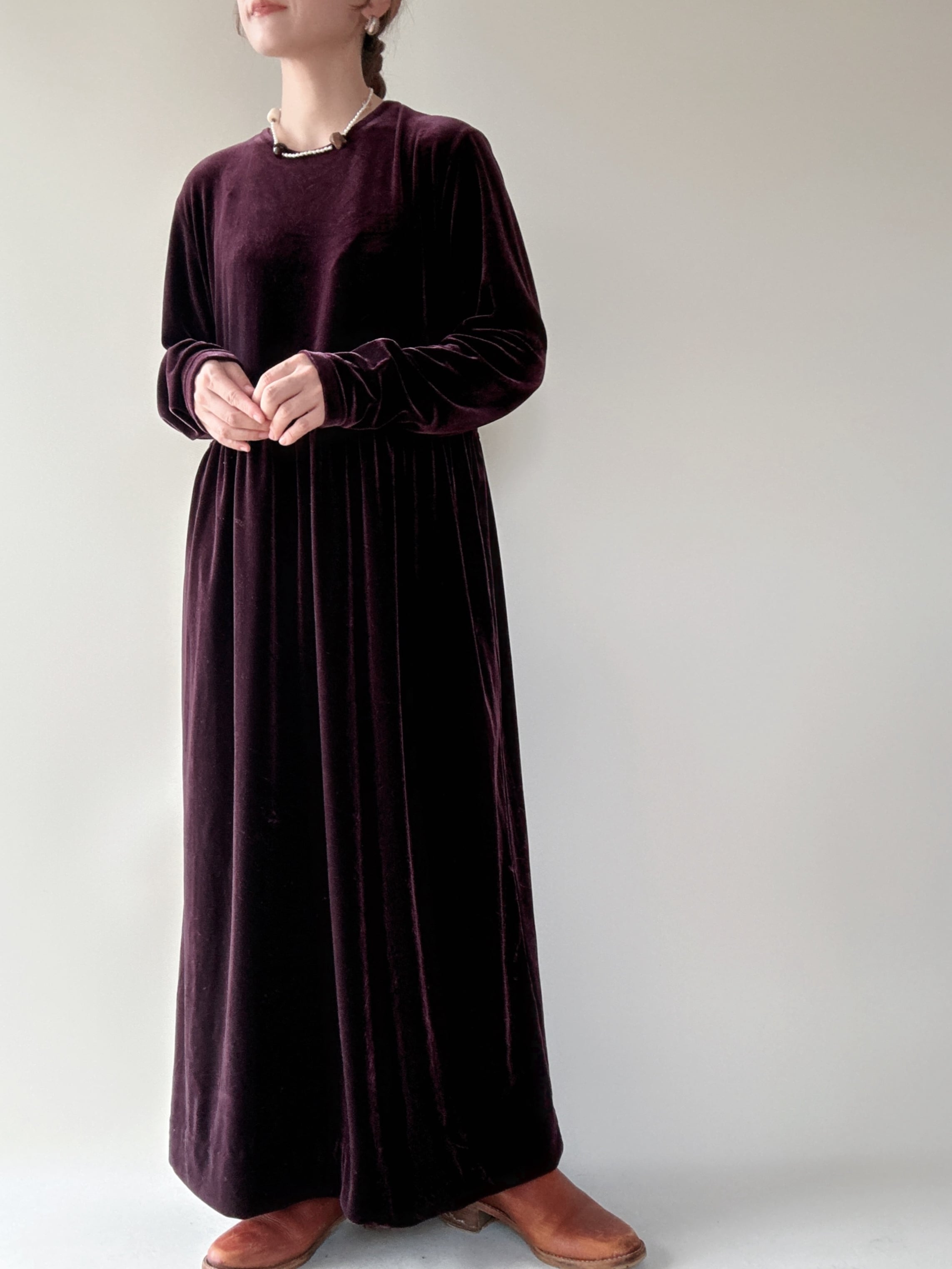 柔らかなベロア素材のシンプルな長袖ロングワンピースです。