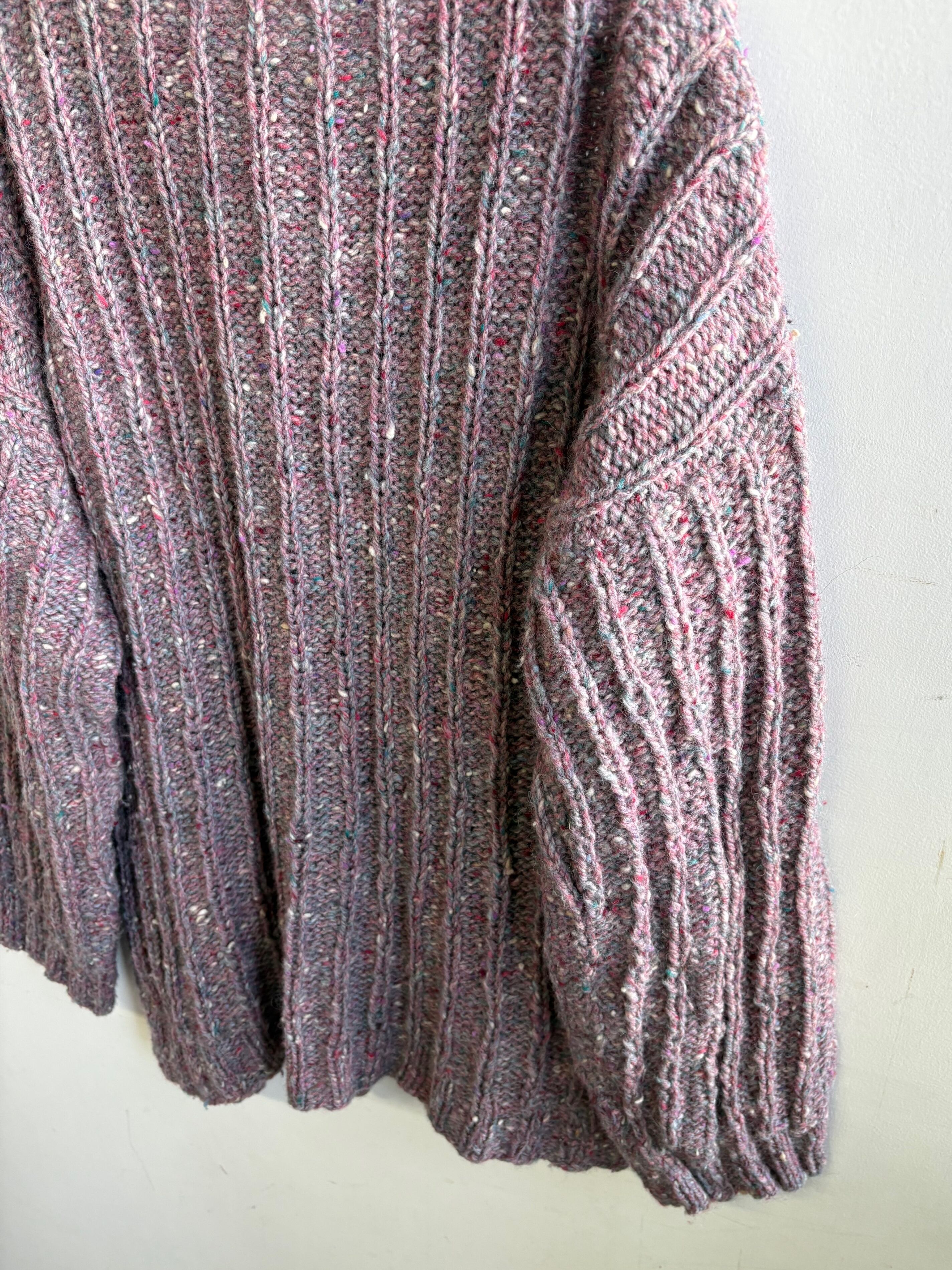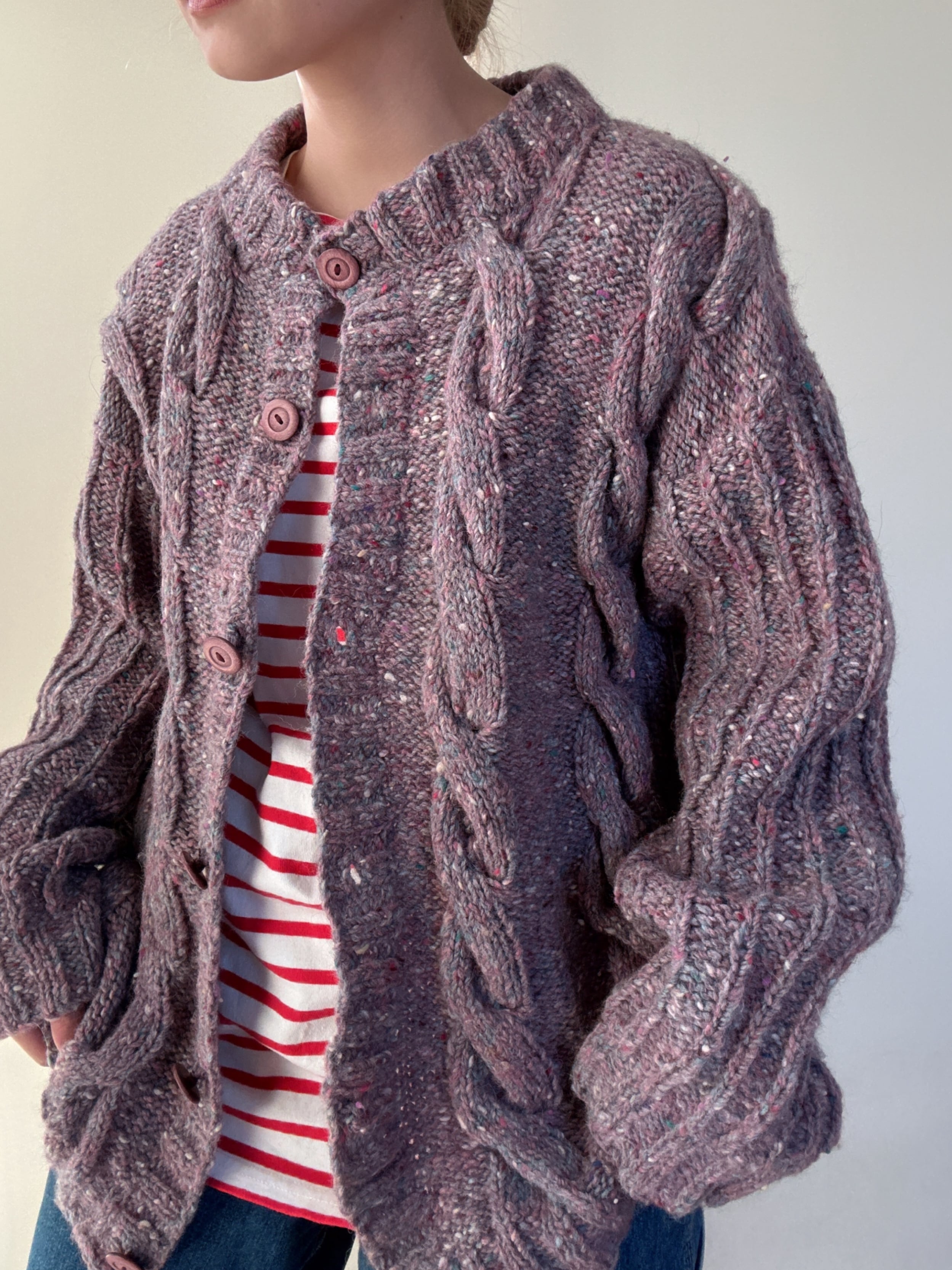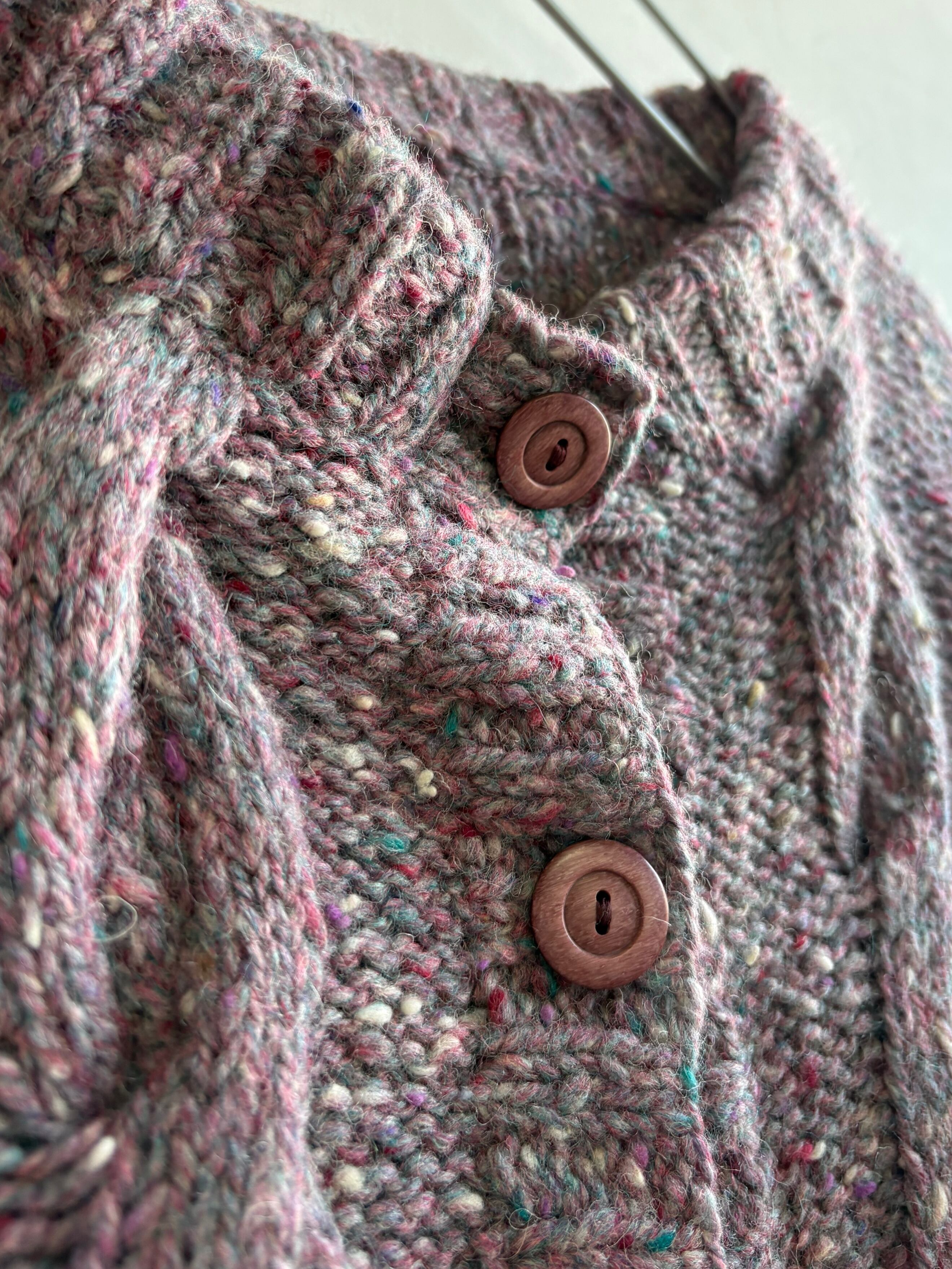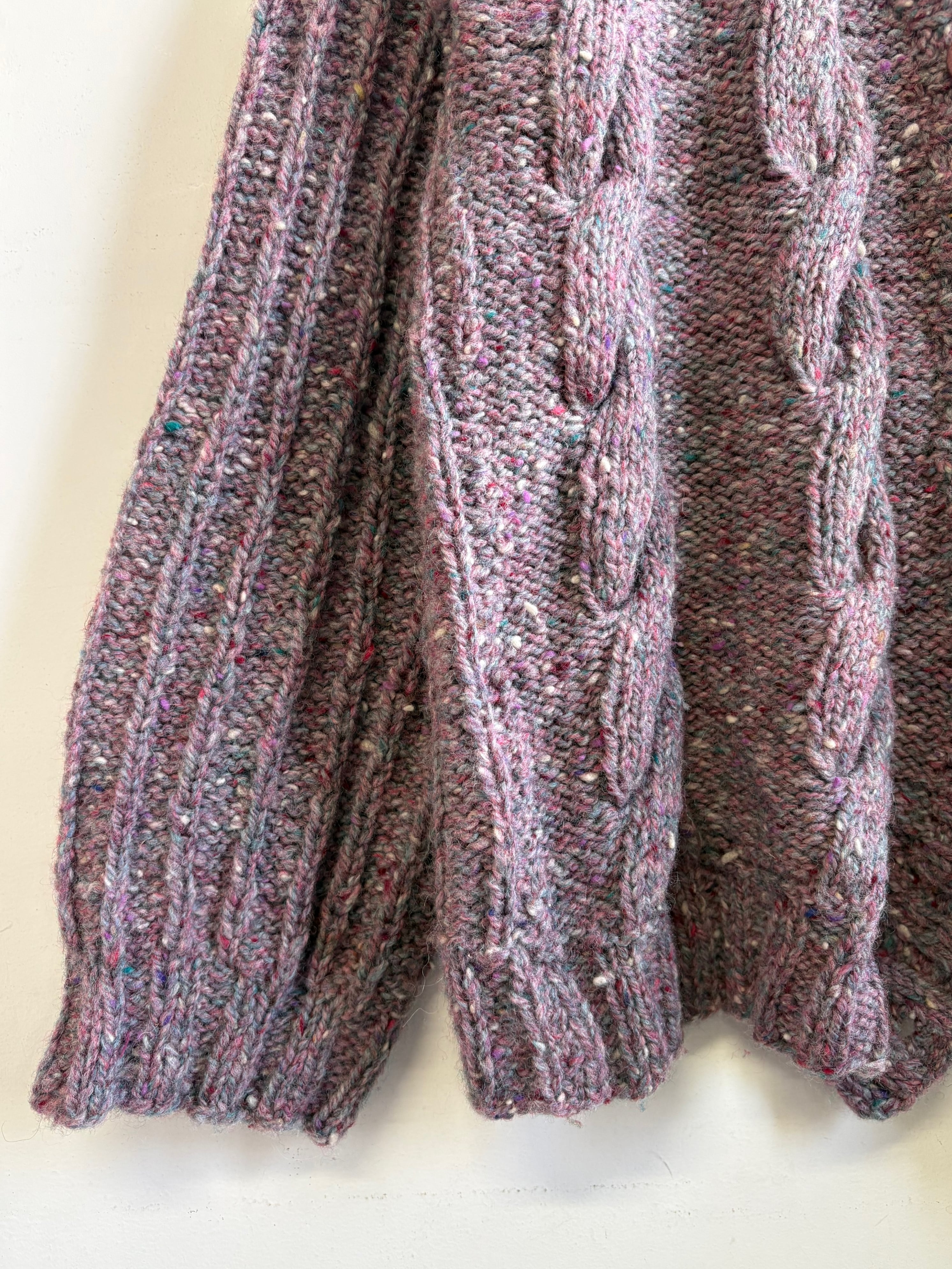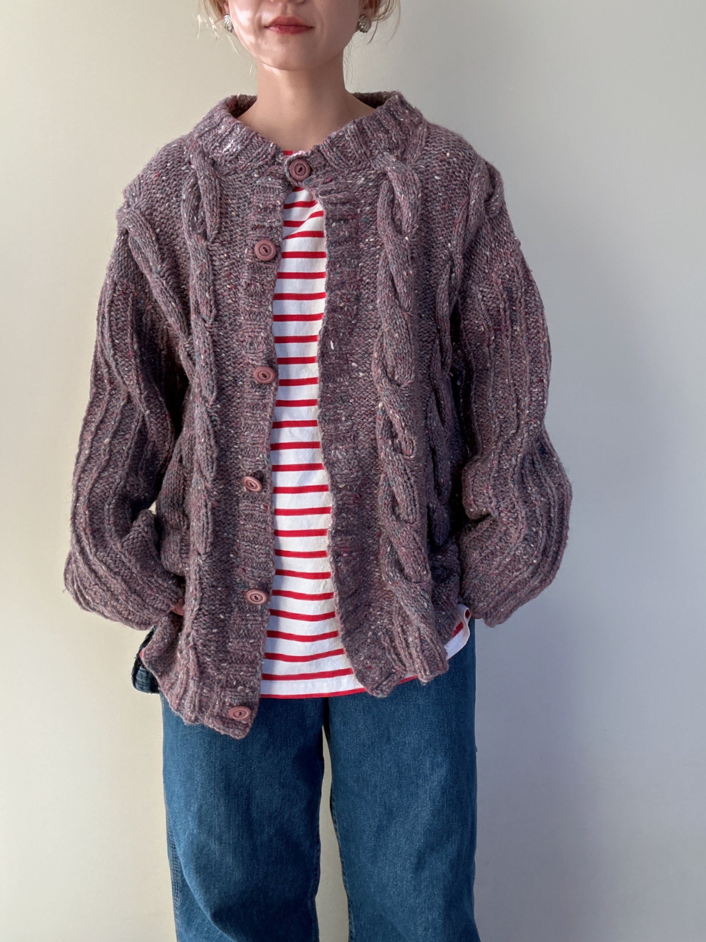 鮮やかなピンクやアイボリー色の色が混ざった糸を使用しており、