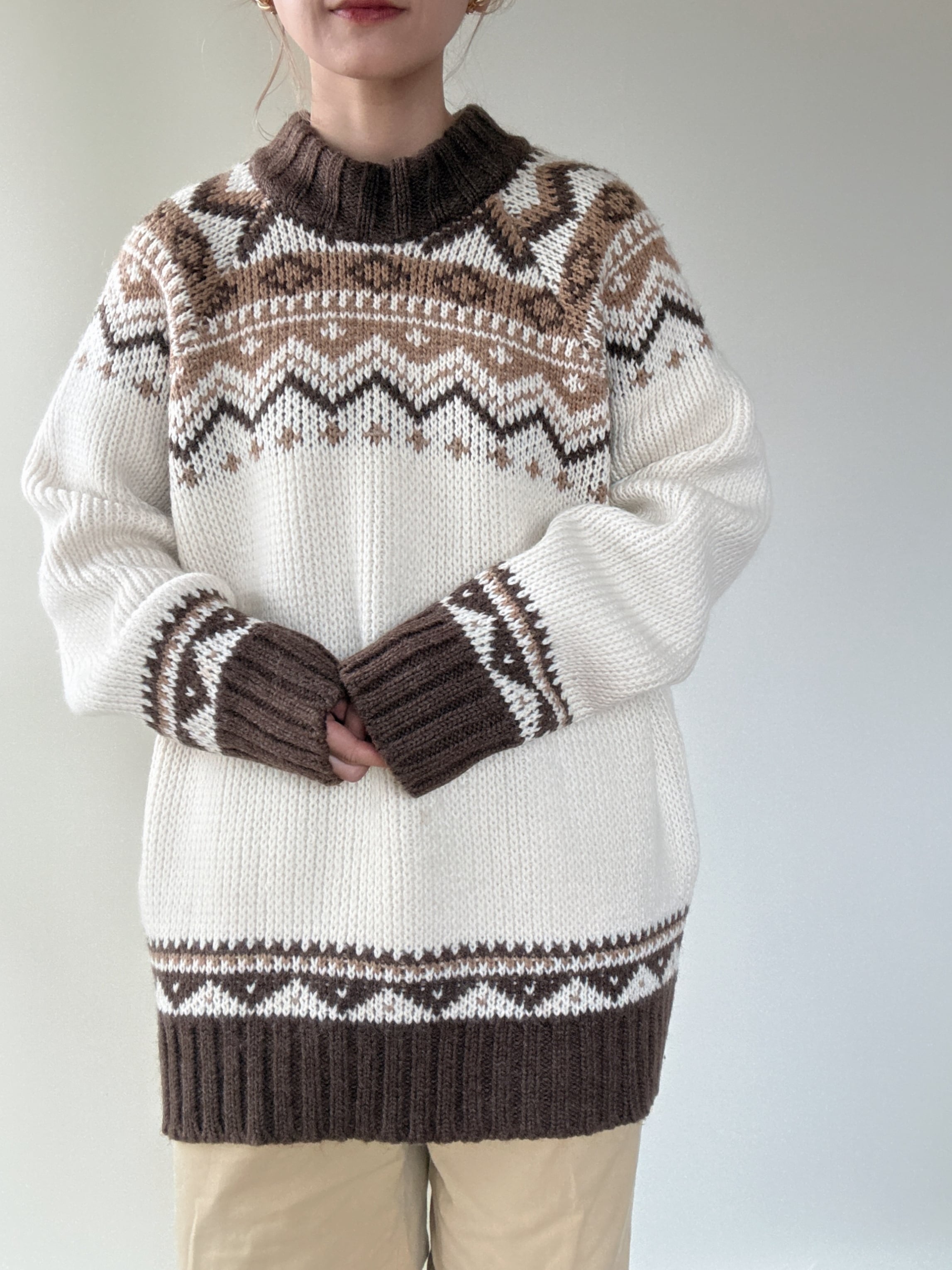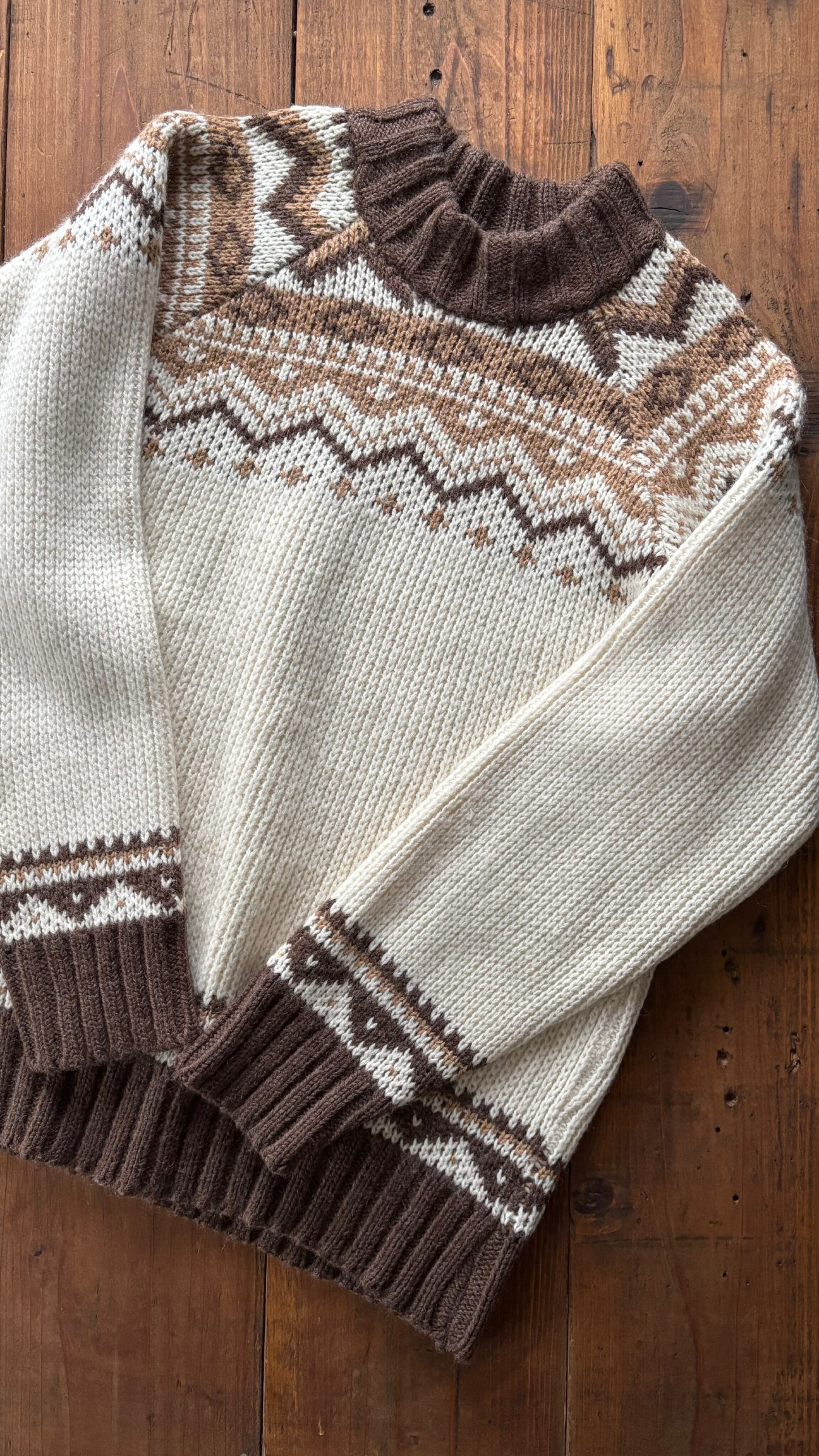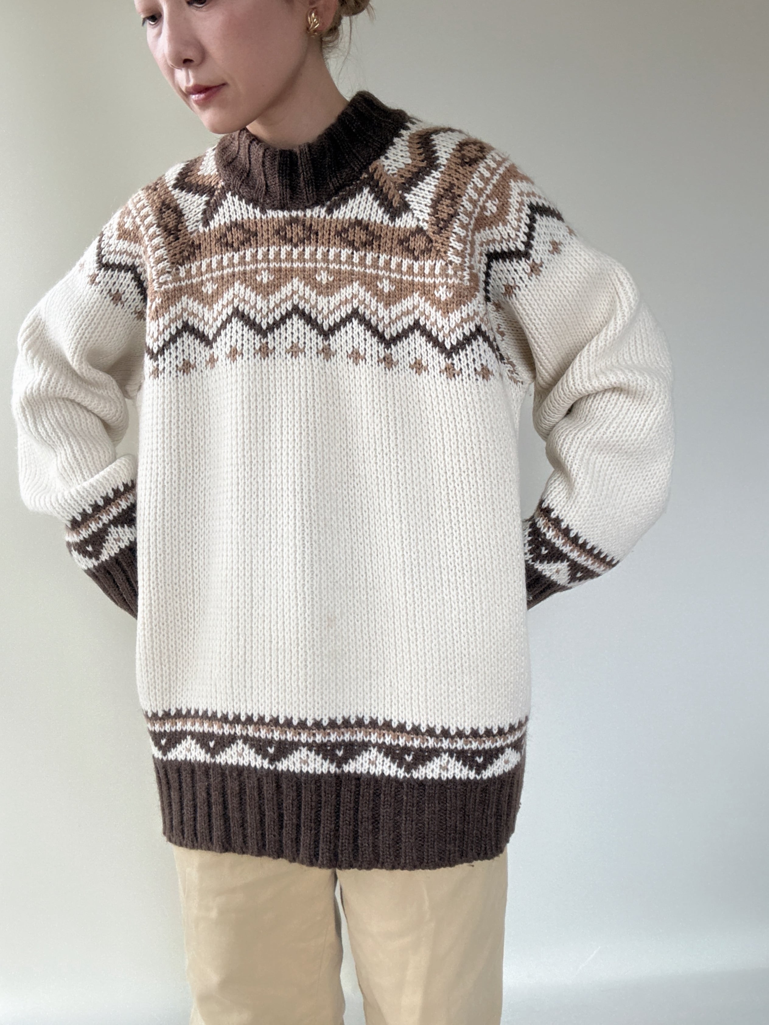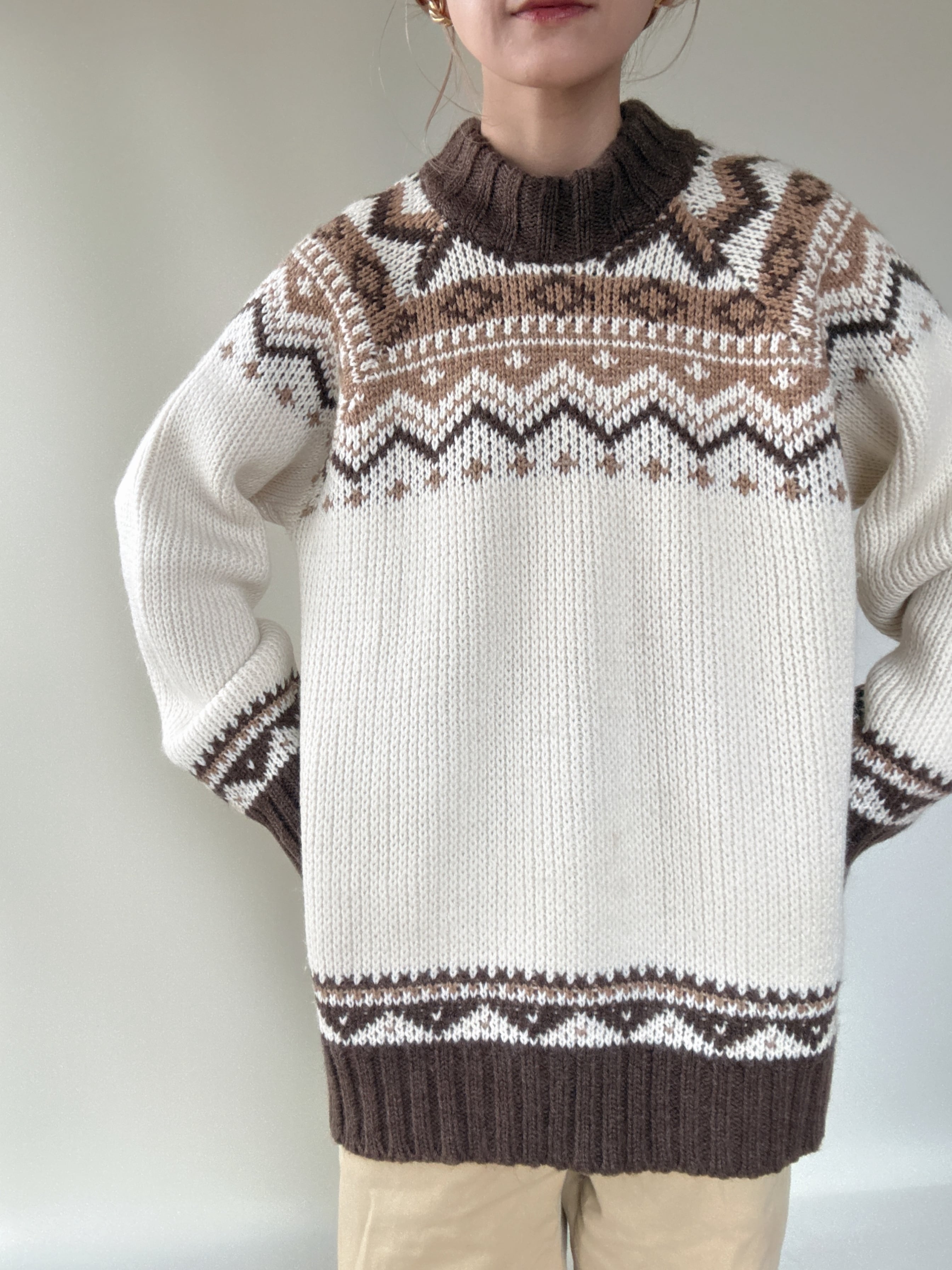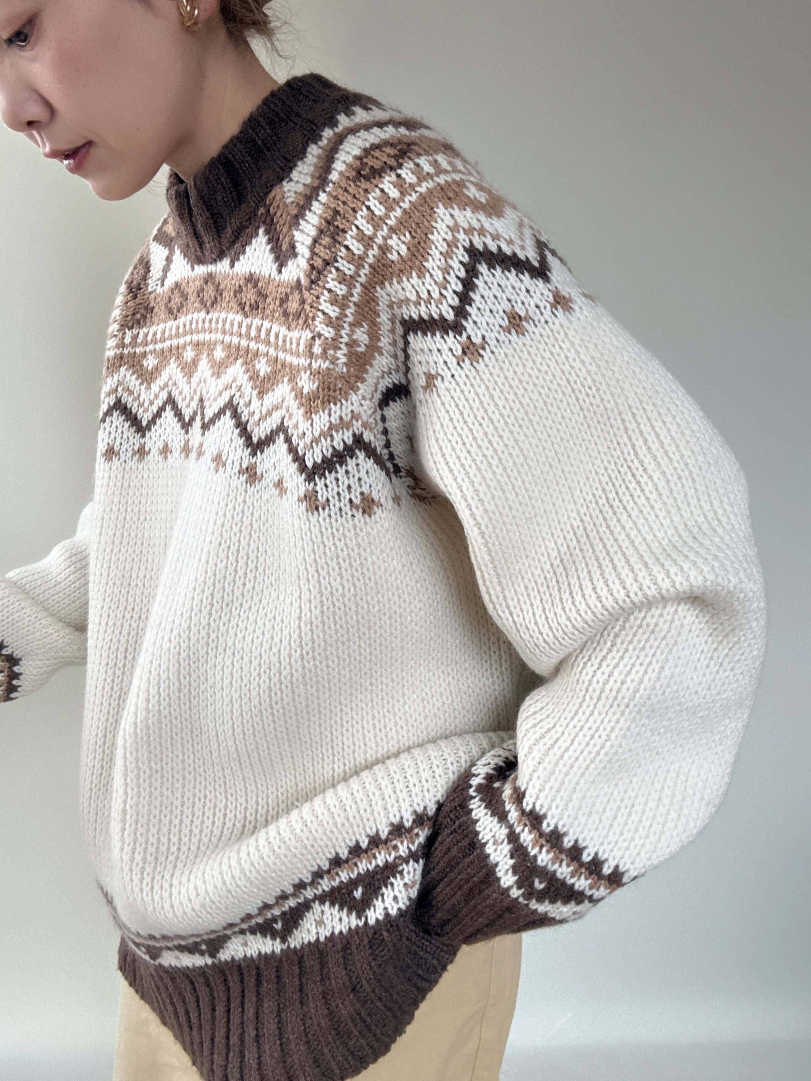 ブラウン、ベージュのノルディックデザインが温かみあるヨーロッパ製のセーターです。