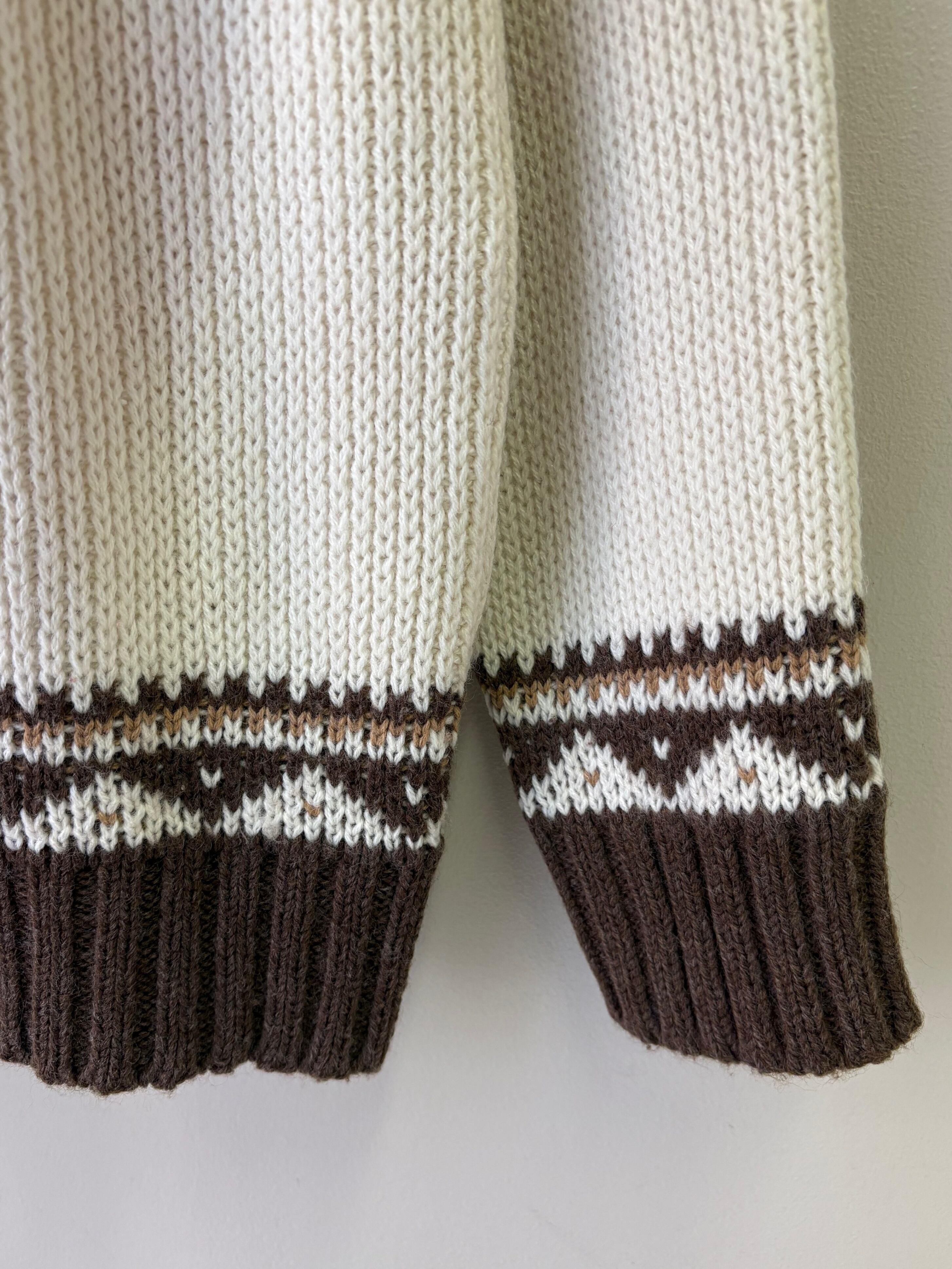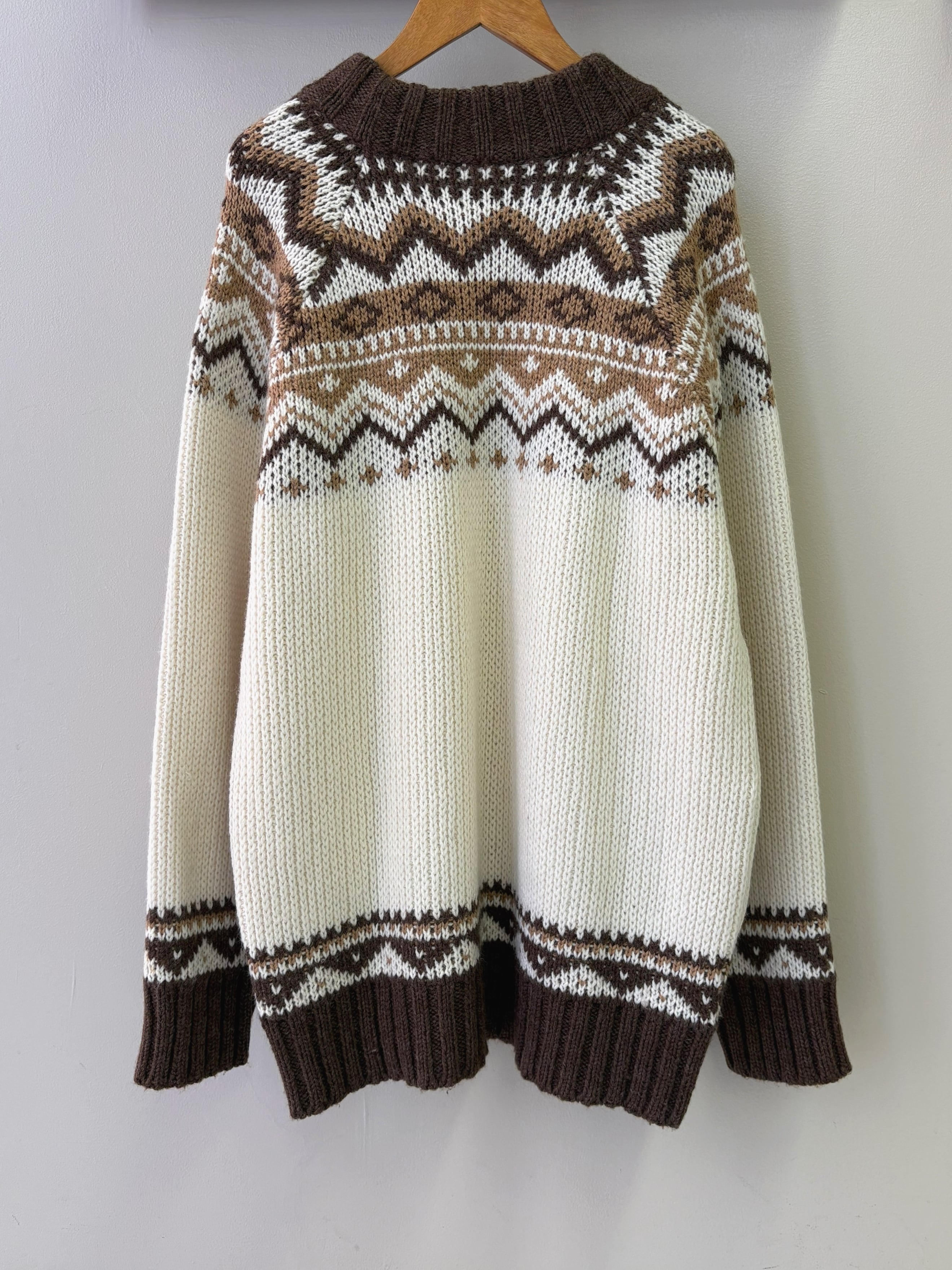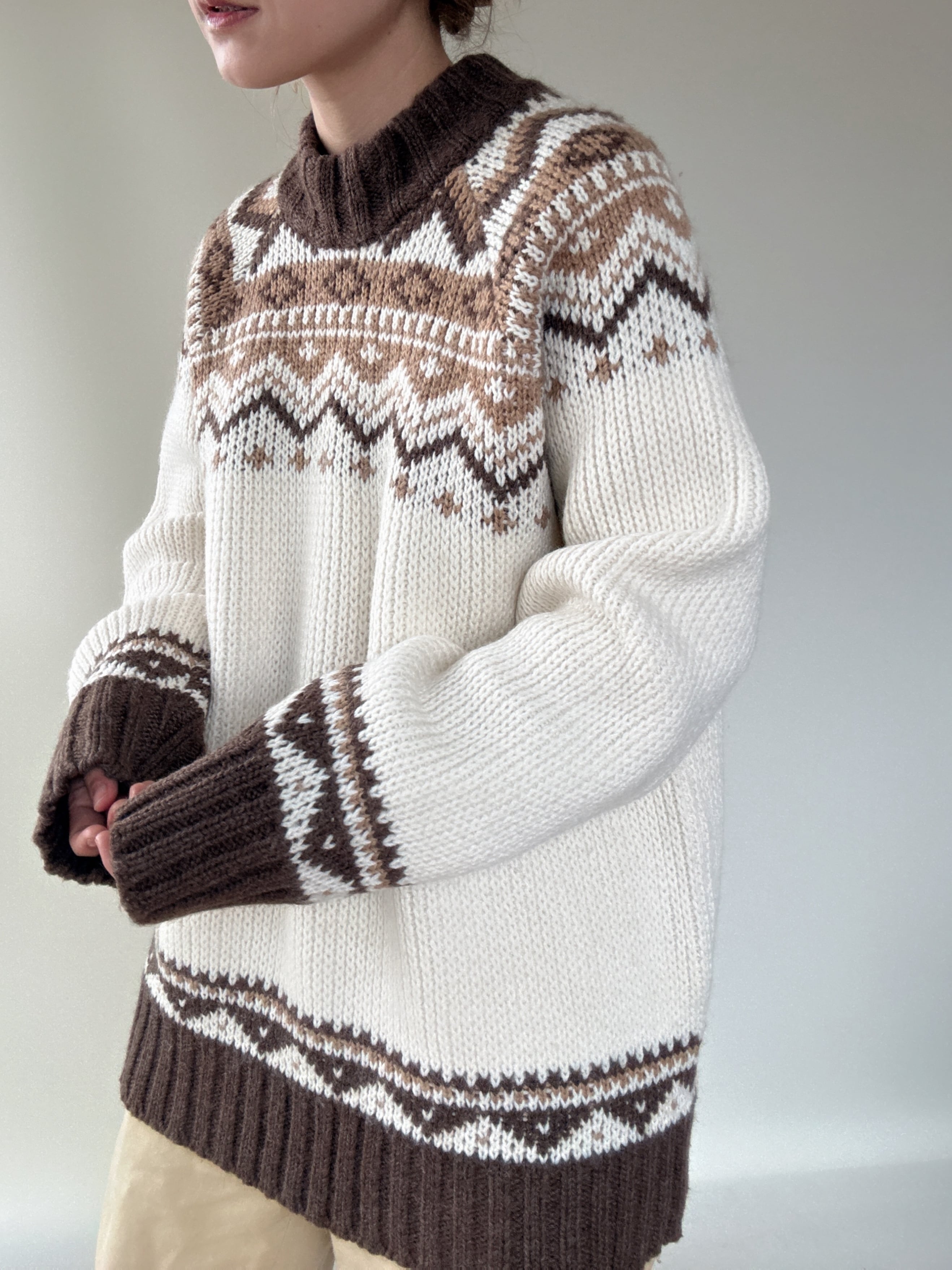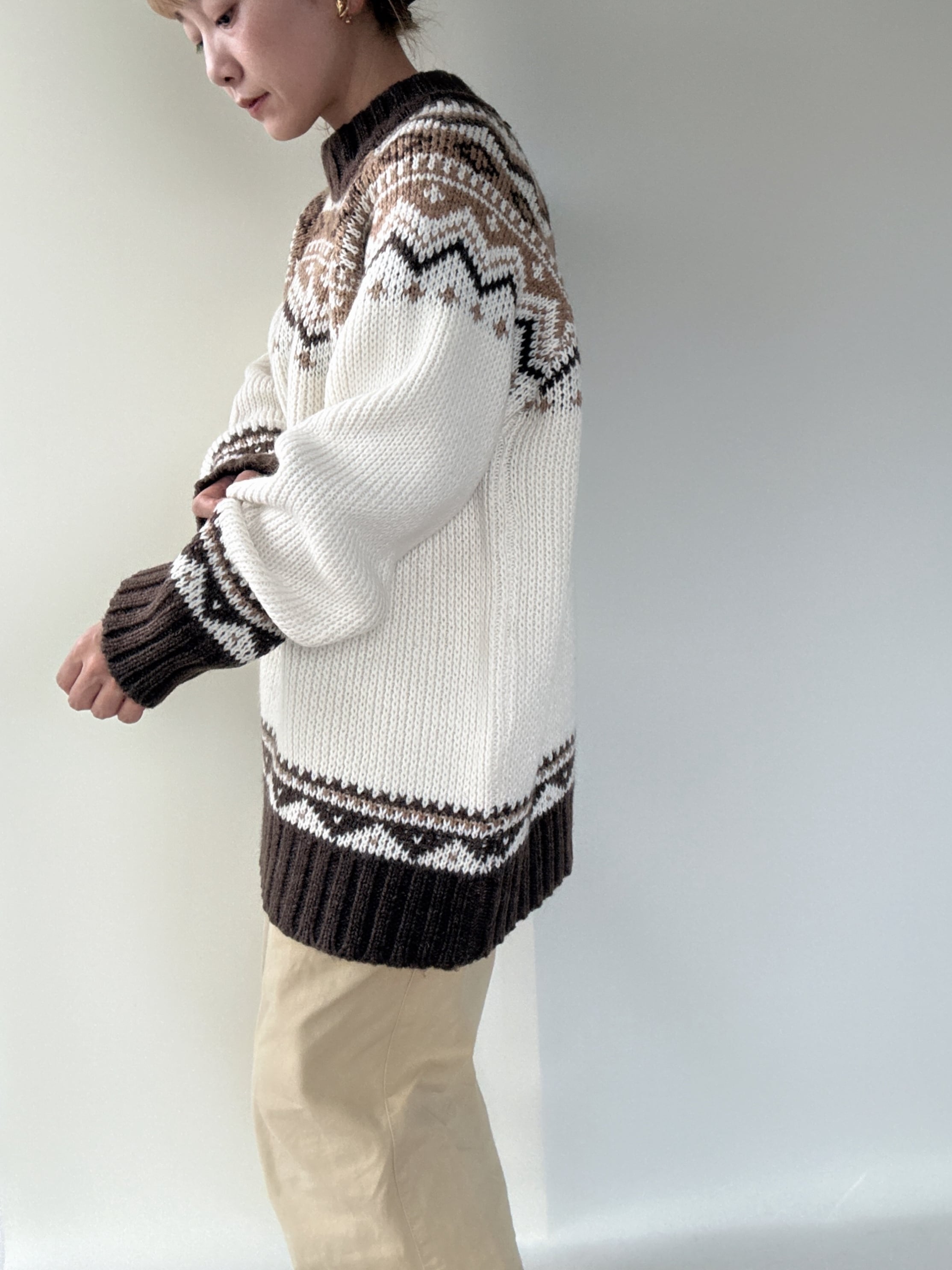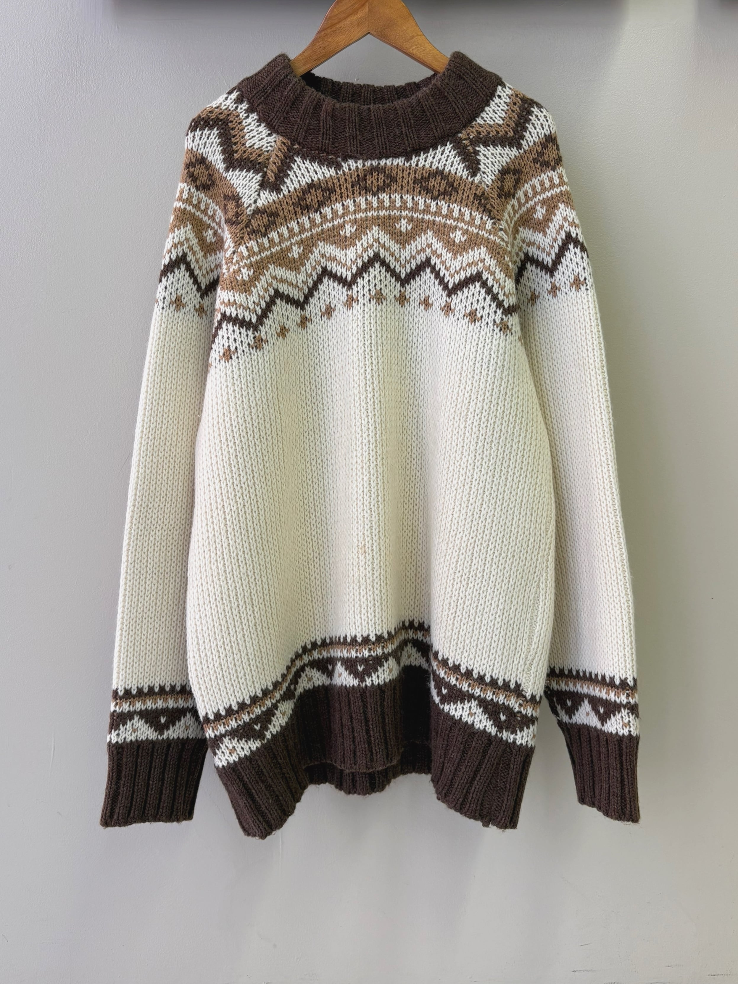 ブラウン、ベージュのノルディックデザインが温かみあるヨーロッパ製のセーターです。