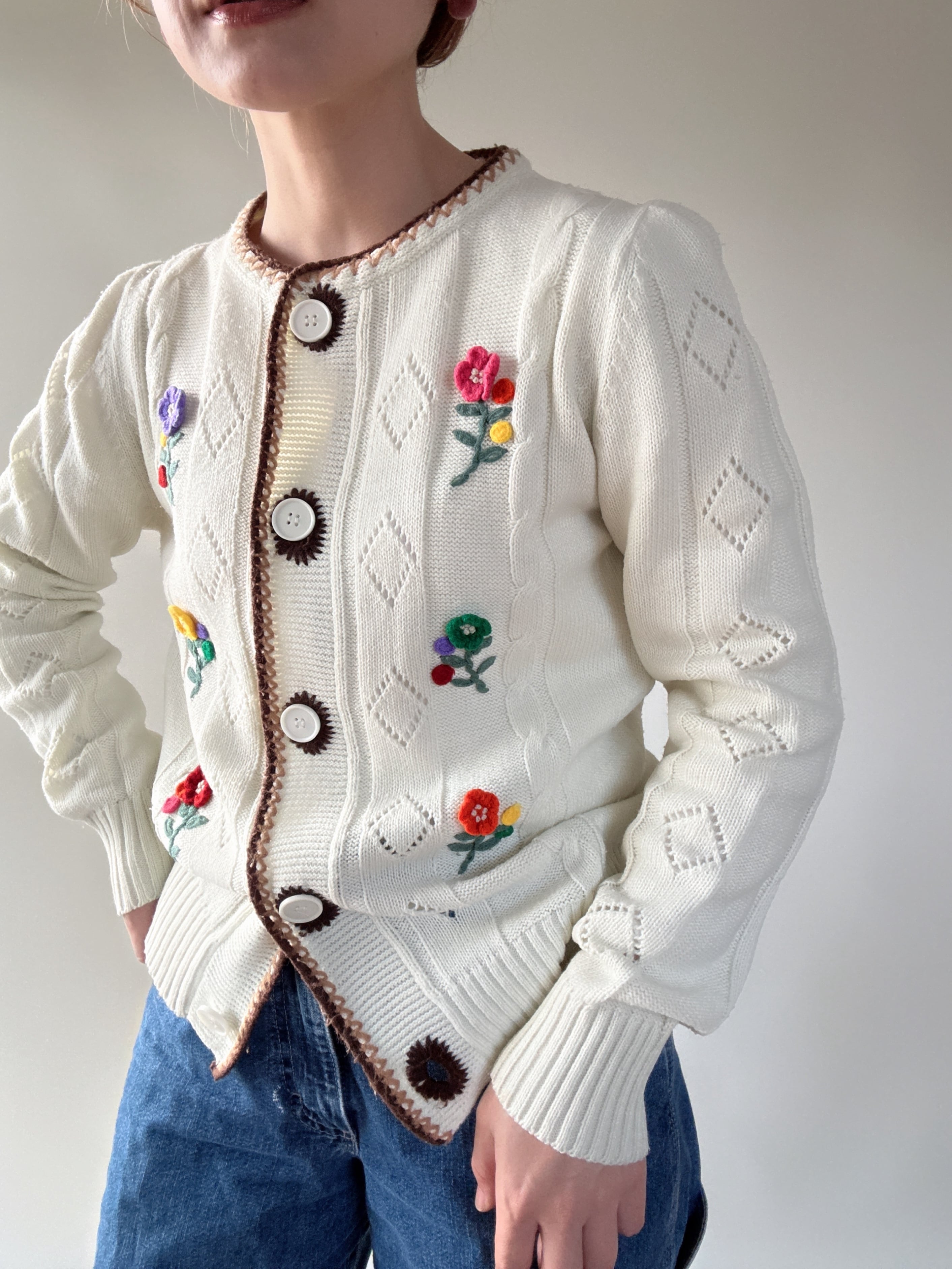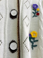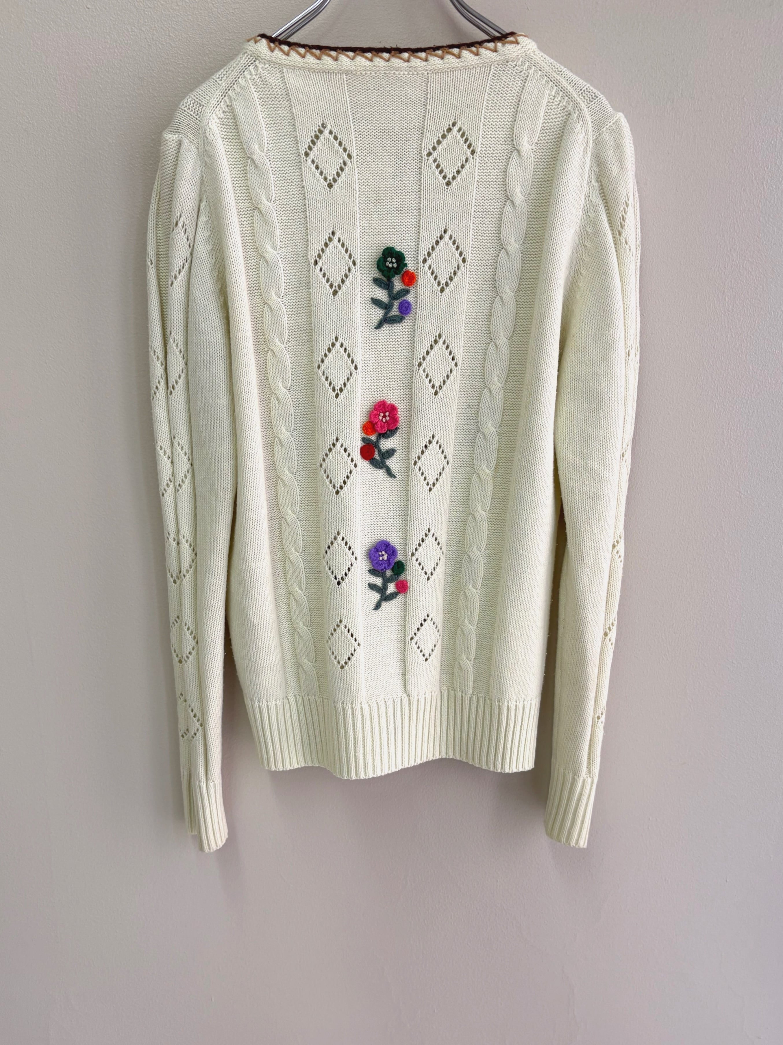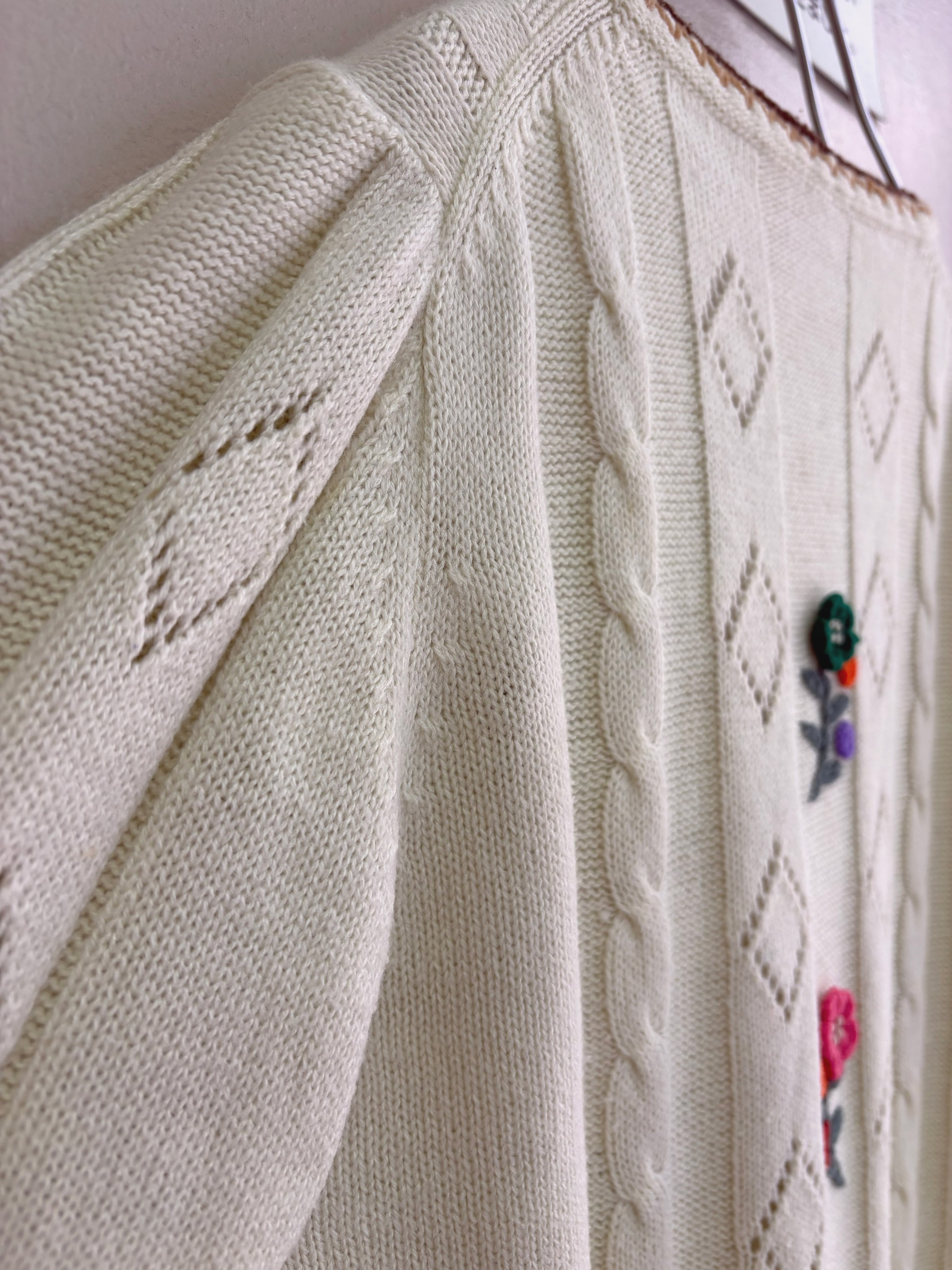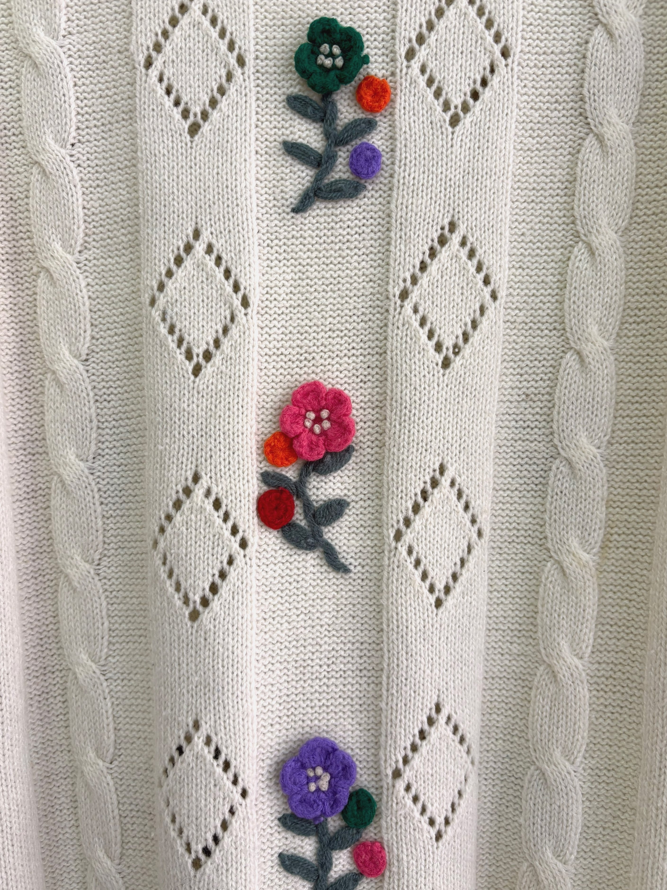ひし形のかぎあみの花モチーフが縫い付けてあり,