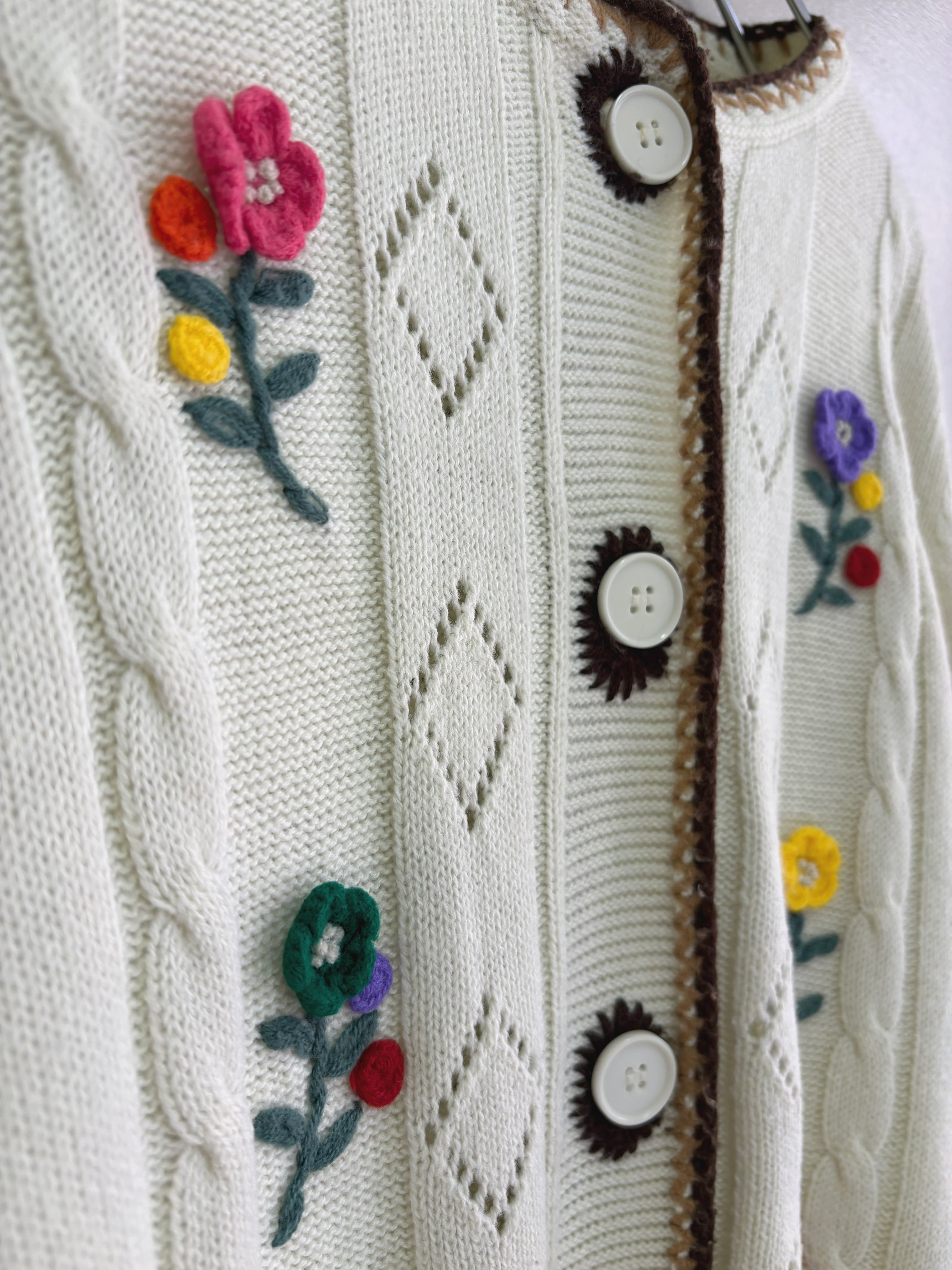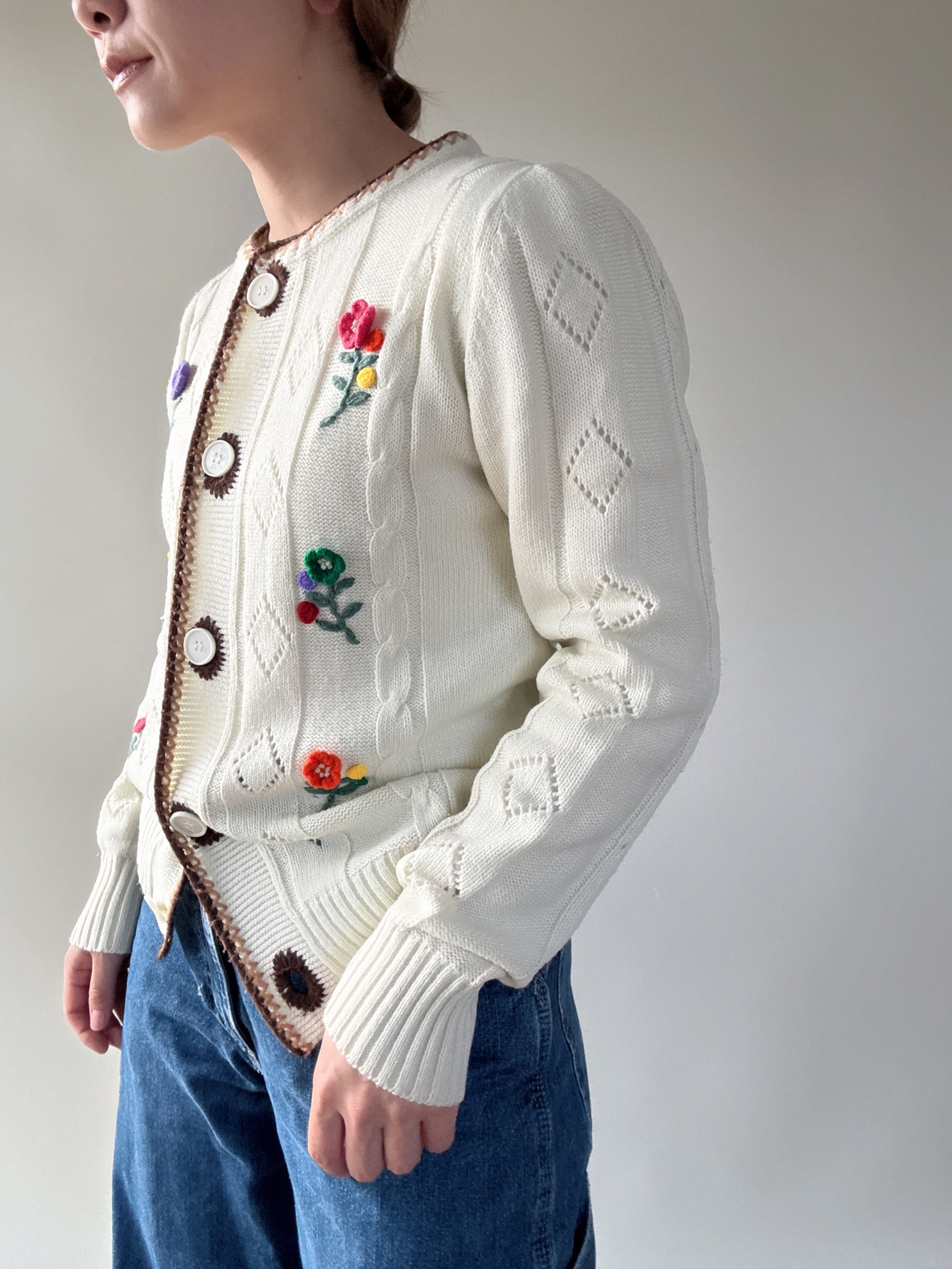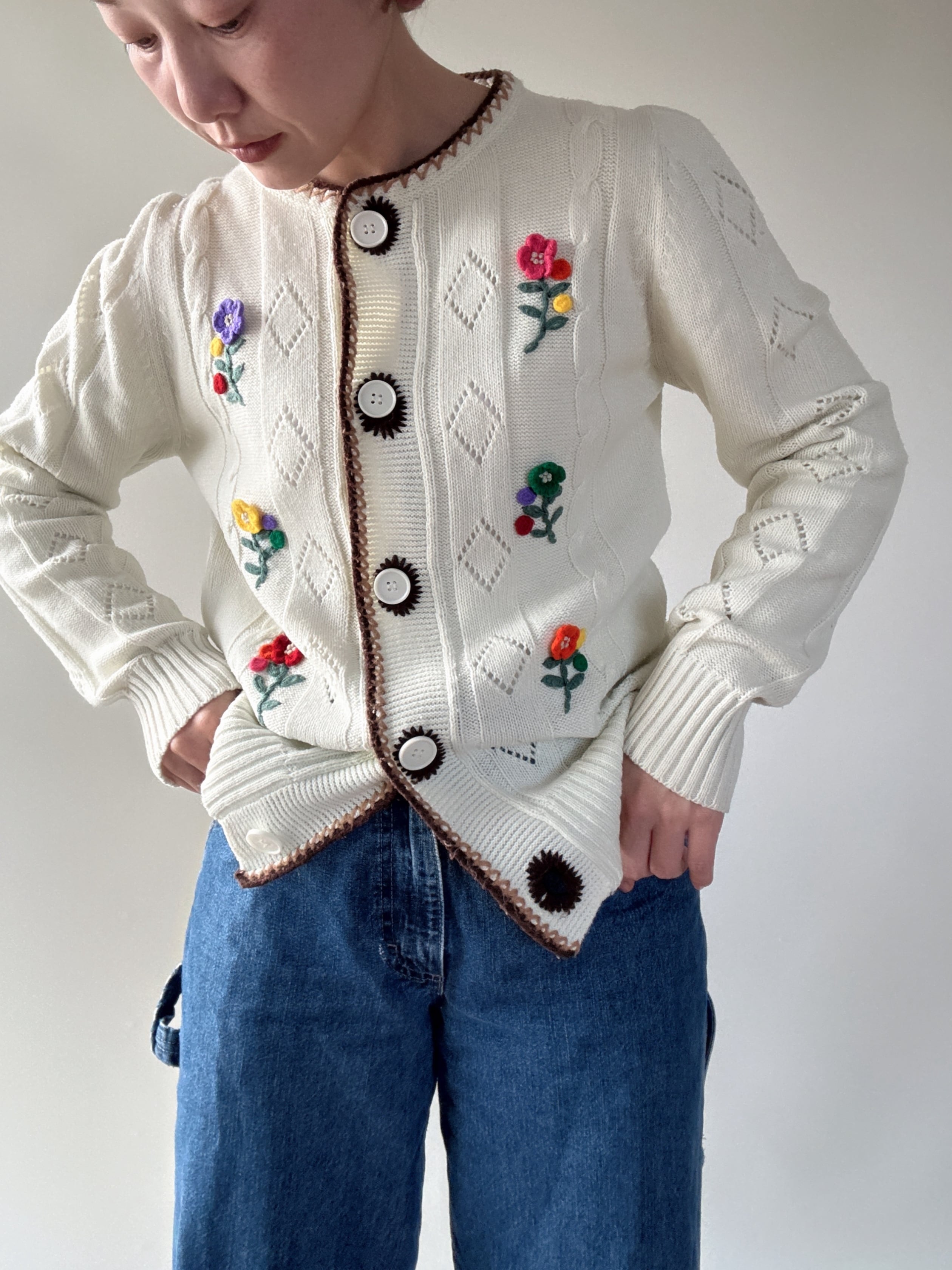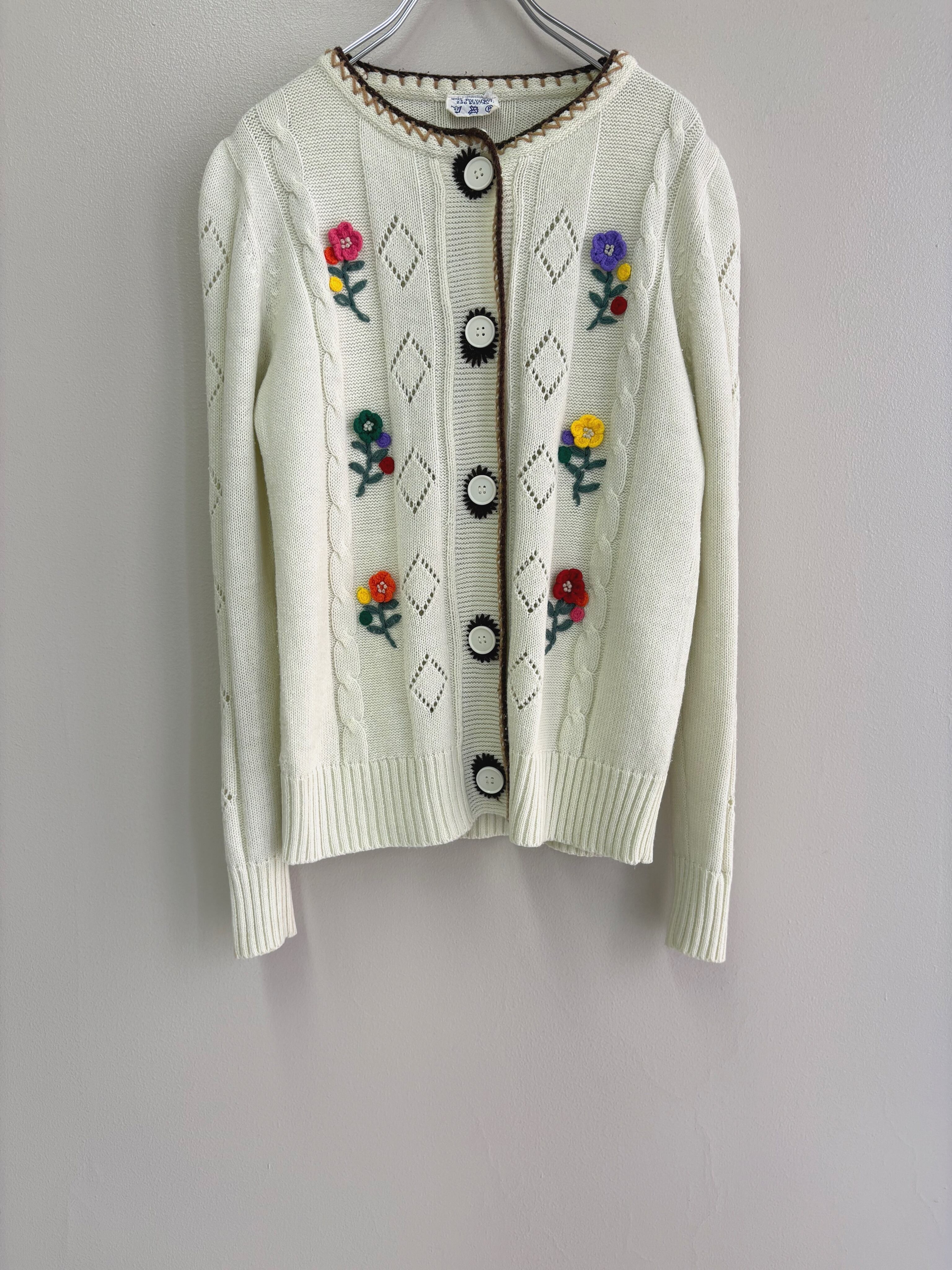 ひし形のかぎあみの花モチーフが縫い付けてあり,