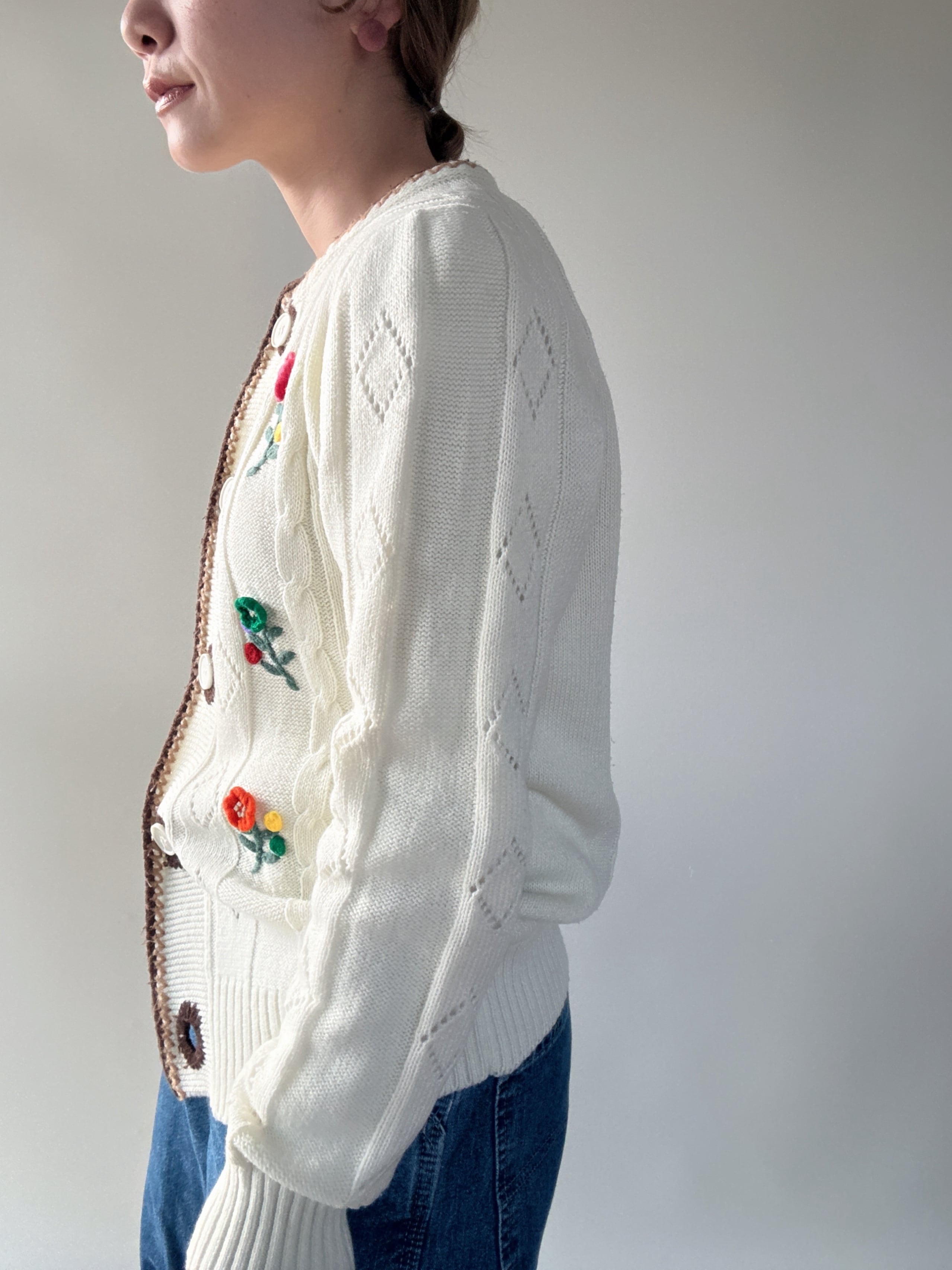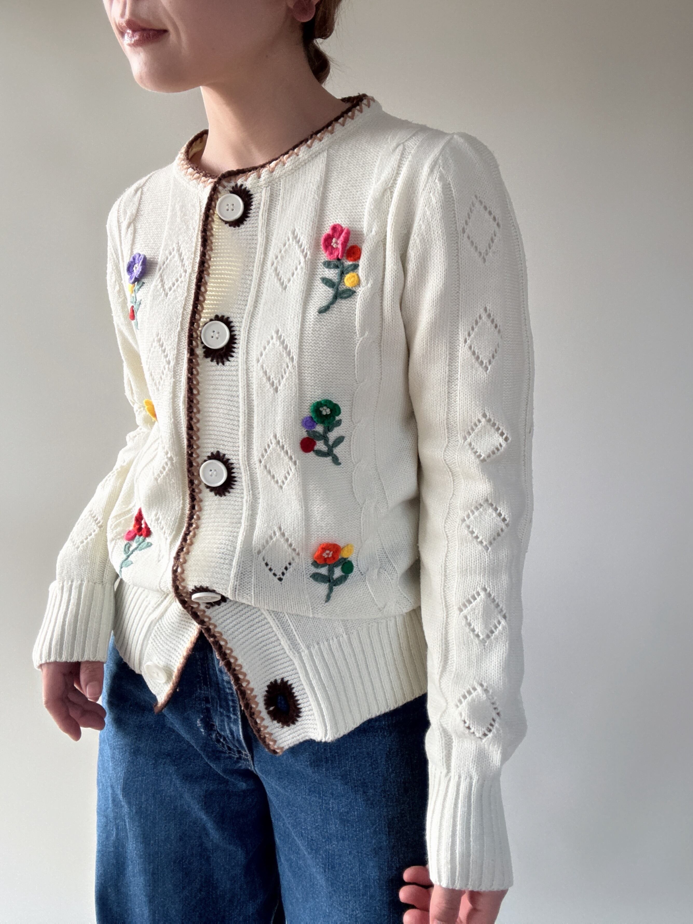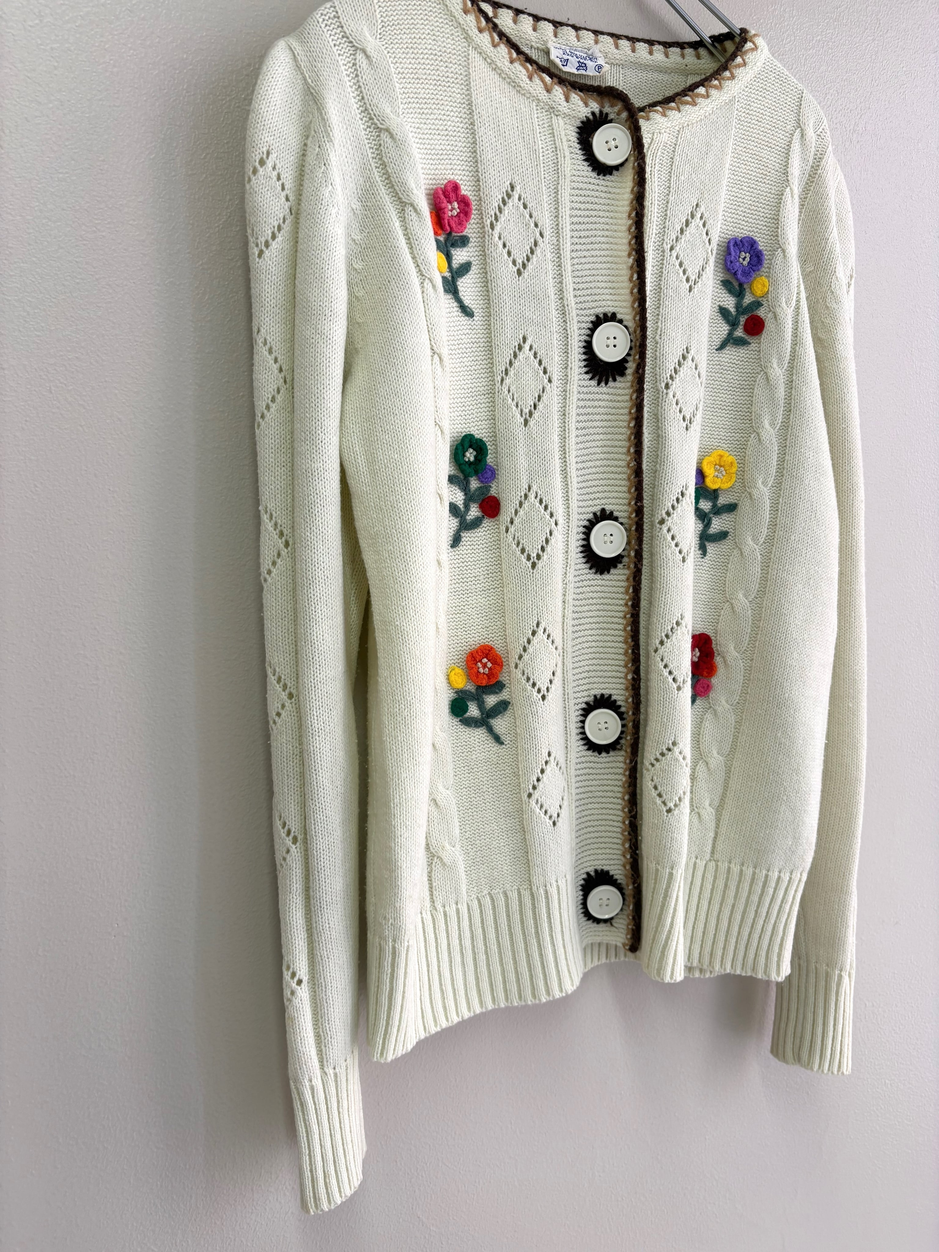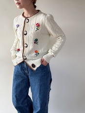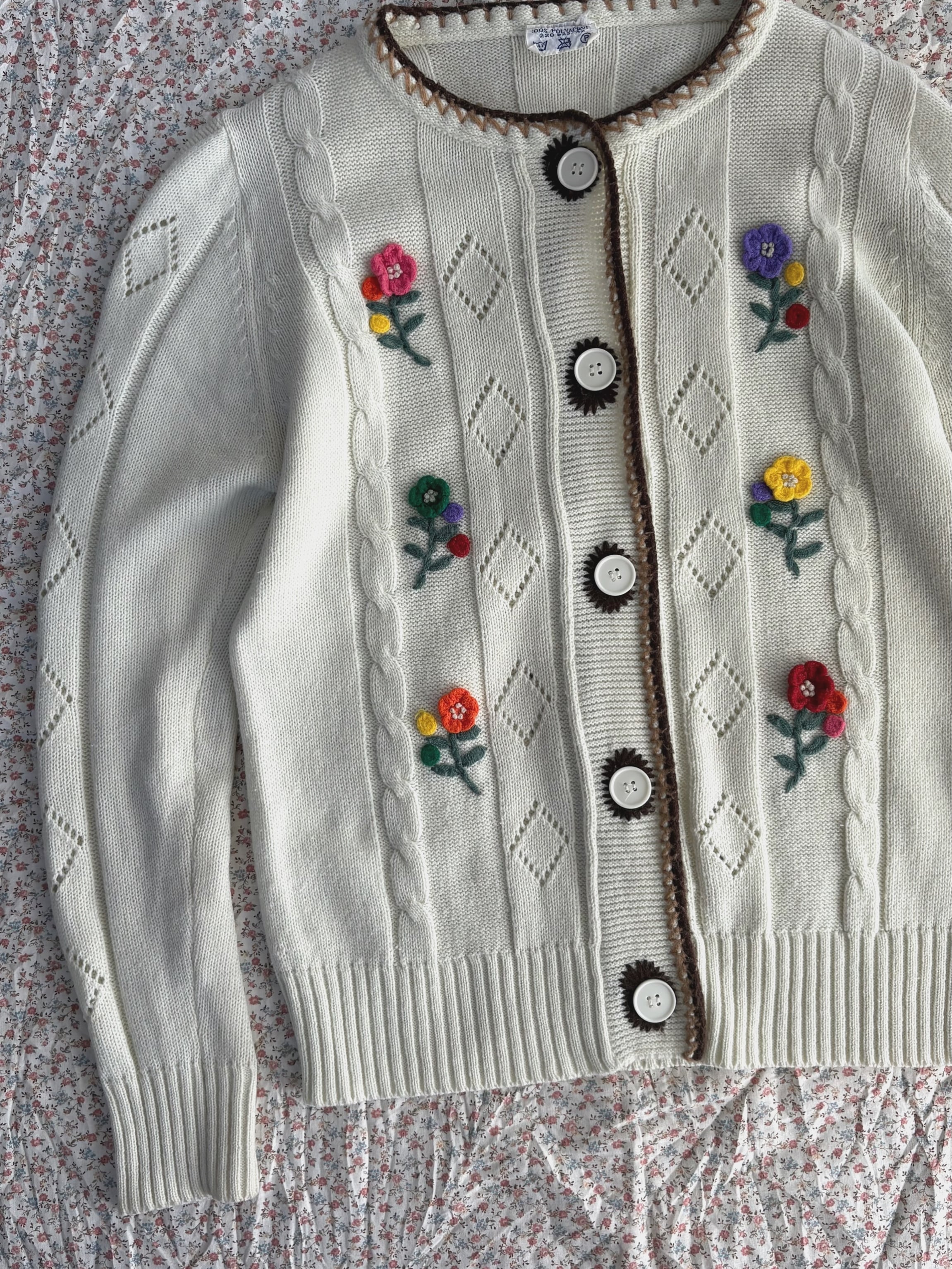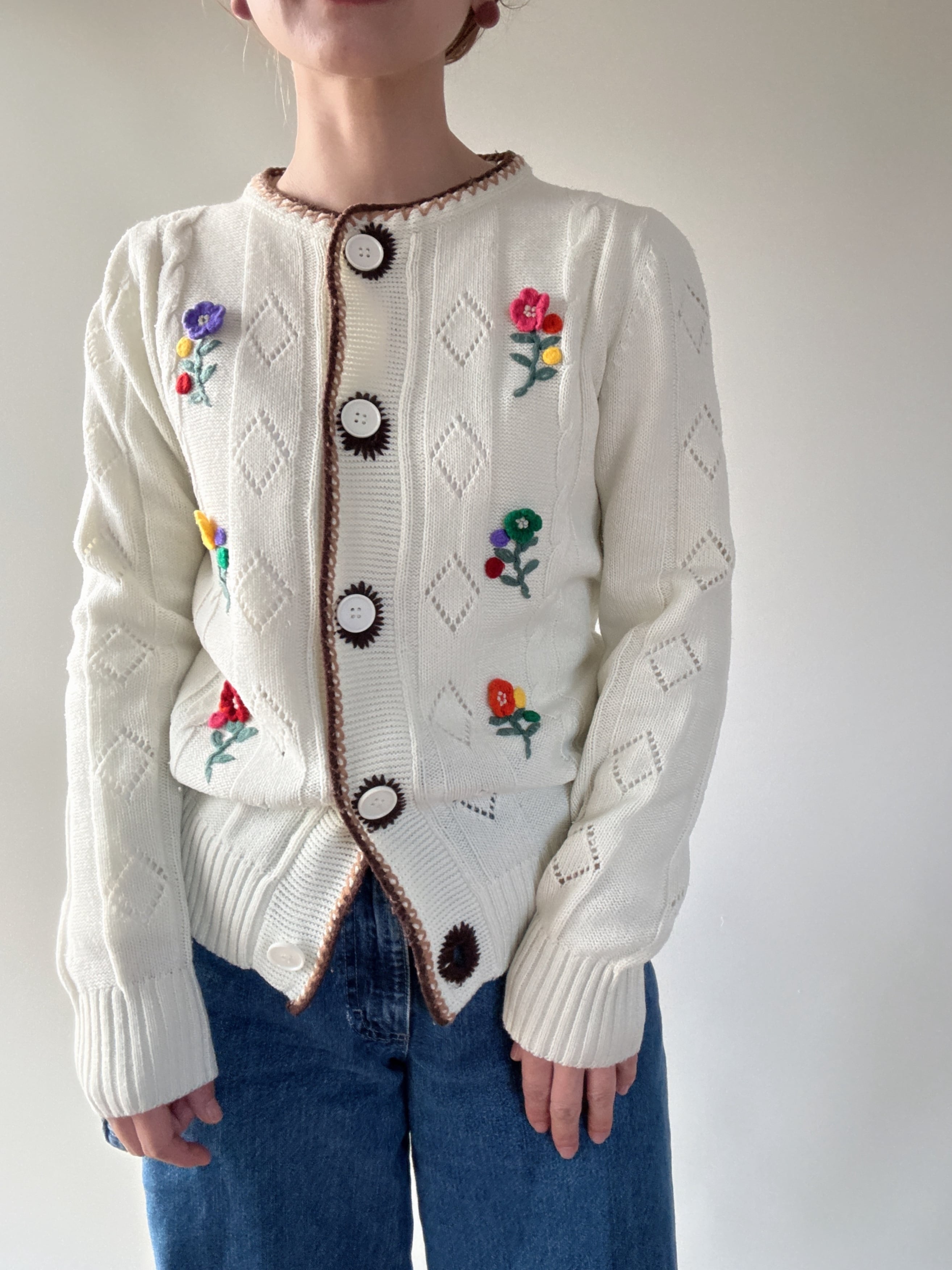 ひし形のかぎあみの花モチーフが縫い付けてあり,