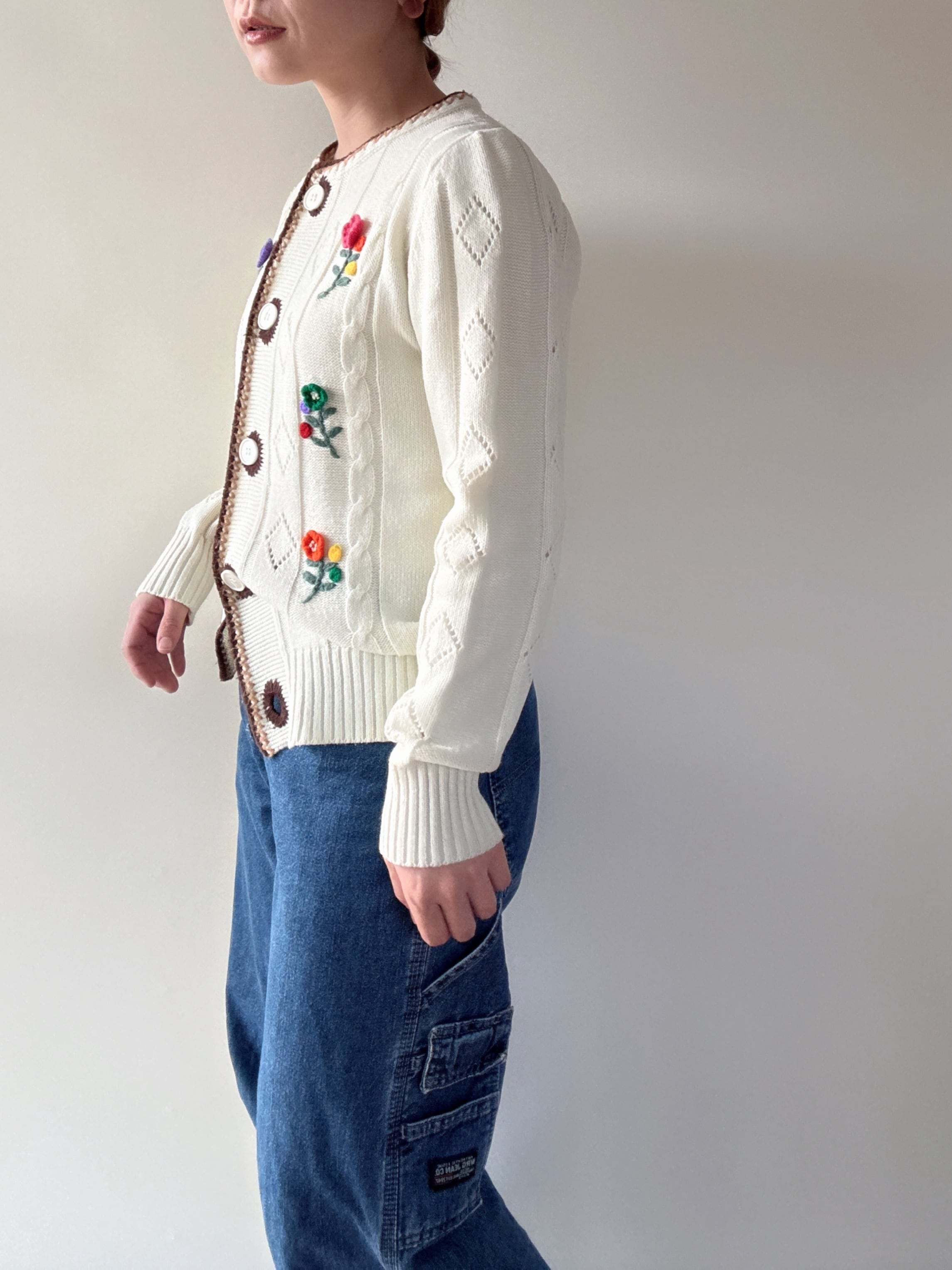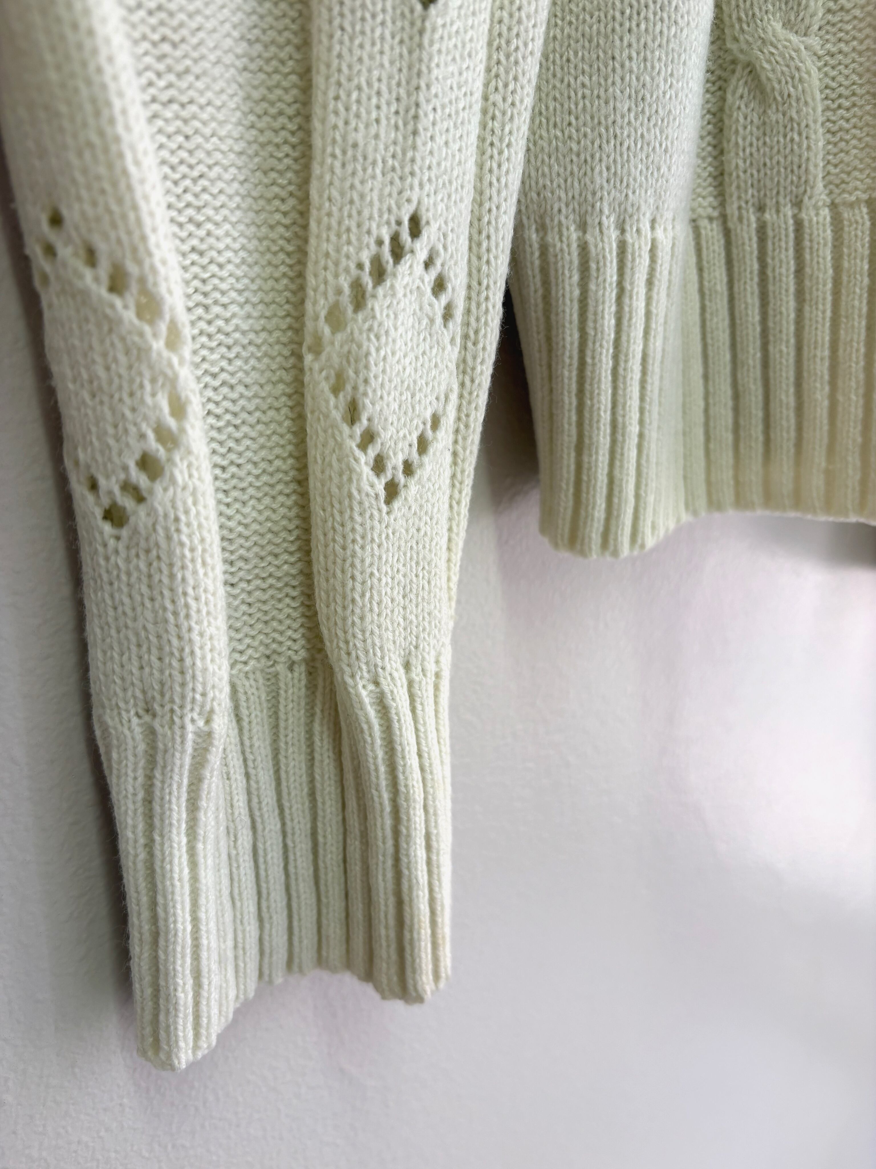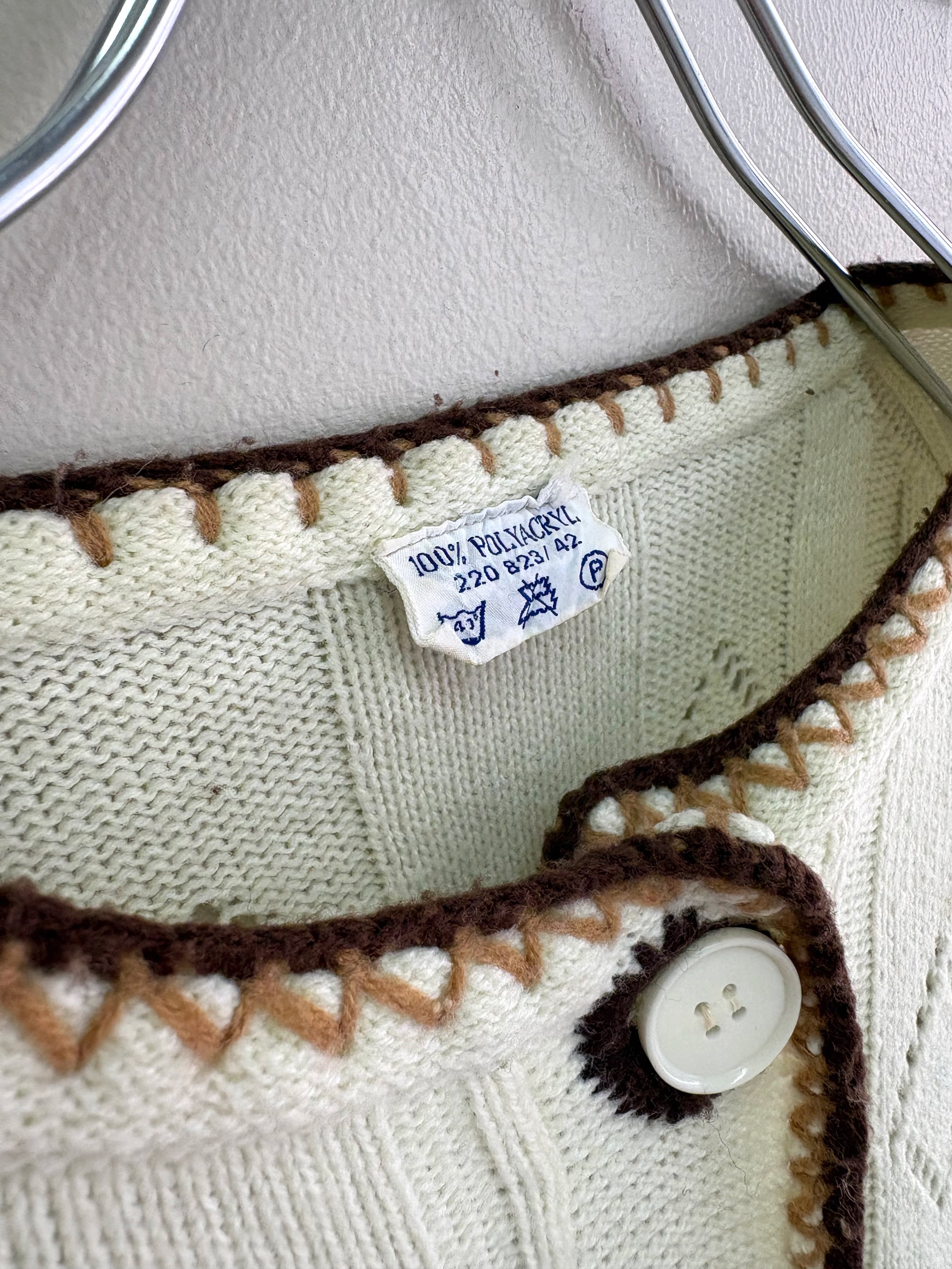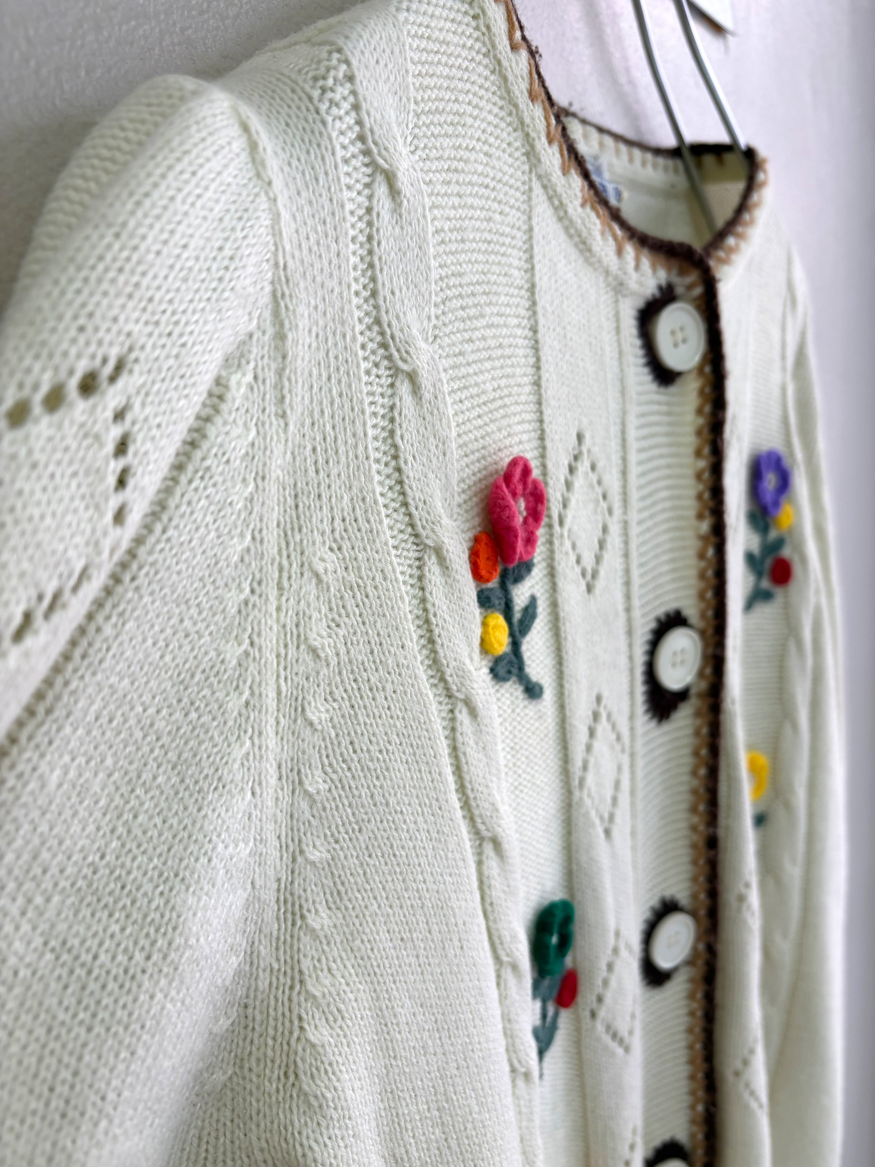 ひし形のかぎあみの花モチーフが縫い付けてあり,